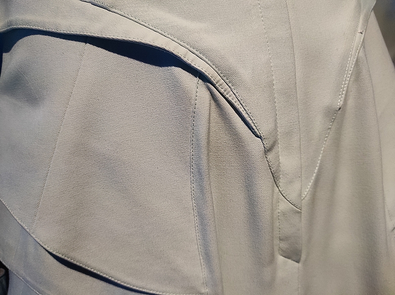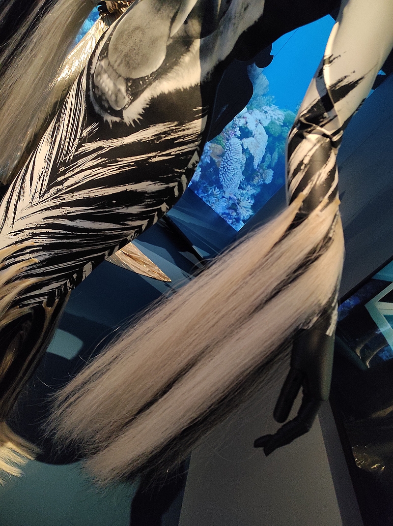 Collection Les Méduses (1999-2000) / modèle « Méduse de bal » : « les basques superposées sur les hanches de ses tailleurs s’ouvrent comme des branchies de poisson. Ses extravagantes Méduses résultent d’une technique inédite utilisant de l’organza plissé, bombé à la main puis laqué, avec des insertions de caoutchouc rappelant des tentacules ». La guide nous avait conseillé d’aller voir une vidéo de cette robe portée. Si ça vous intéresse, c’est par ici !