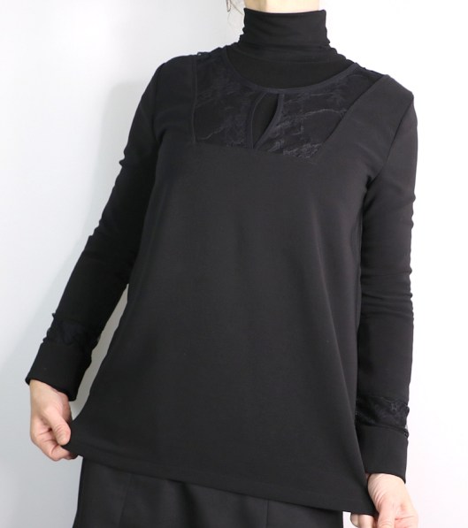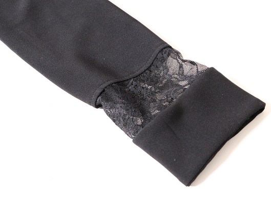 J’ai rabattu les marges de couture non pas côté dentelle mais côté jersey pour éviter que celles-ci ne se voient pas transparence. J’ai donc fait une piqûre à la machine à coudre pour le haut et pour le bas, j’ai rabattu les marges à la main, côté poignets :