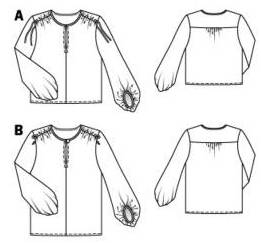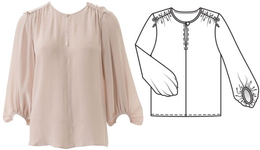 C’est une blouse qui est fendue au niveau du décolleté et qui est froncée au niveau des empiècements devant et dos. Des liens à nouer permettent de froncer davantage au niveau de l’épaule. Les manches sont 3/4 de longueur asymétrique (plus longues sur l’arrière) resserrées par un fin bracelet : c’est d’ailleurs toute l’originalité de cette blouse.