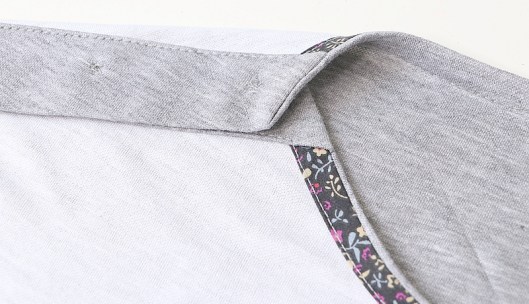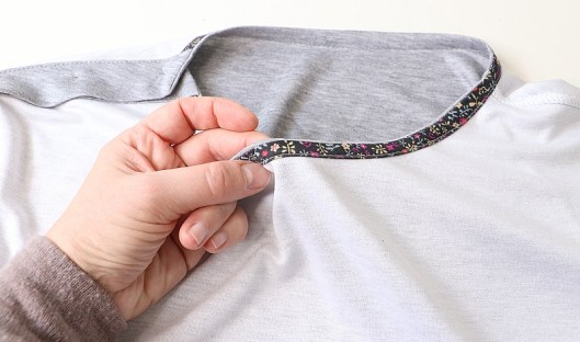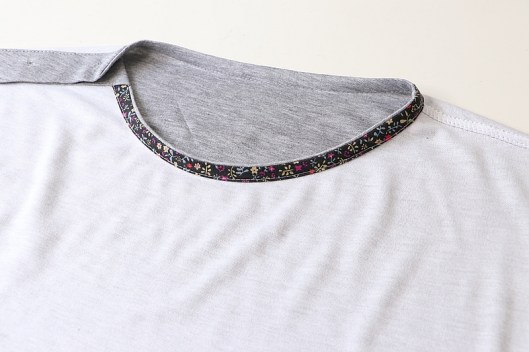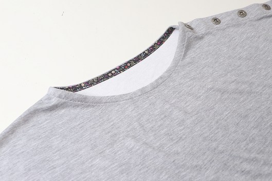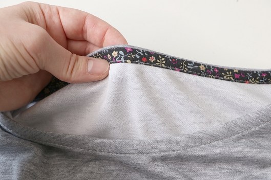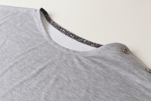 L’encolure est finie par un biais rabattu/plaqué sur l’intérieur.