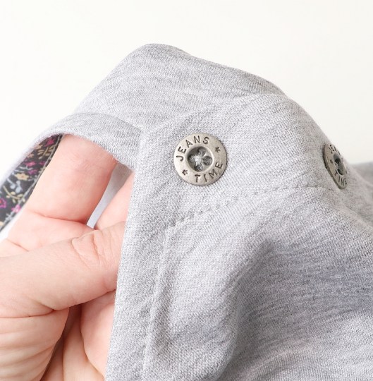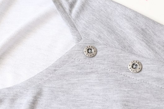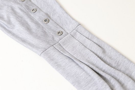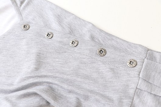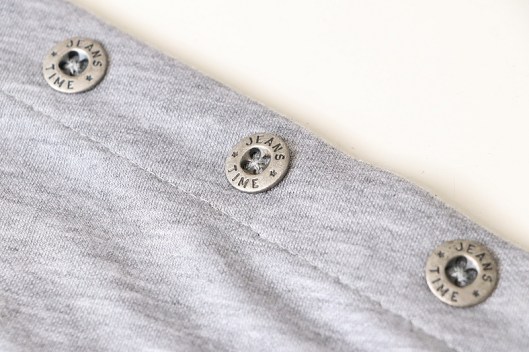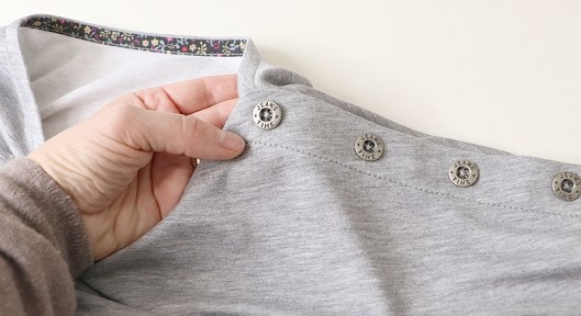 J’ai également cousu 5 boutons au lieu de 4. L’encolure étant suffisamment large pour que j’y passe la tête, je n’ai donc pas cousu de boutonnières.