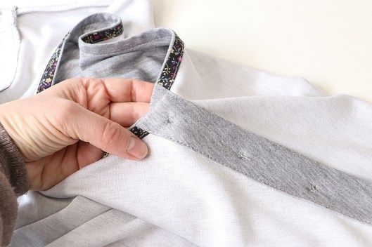 En ce qui concerne la patte de boutonnage au niveau de l’épaule, je l’ai faite plus large que ce que prévoit Atelier Scammit, histoire que ce soit un peu plus couvrant sur l’épaule. Elle est donc ici de 3 cm.