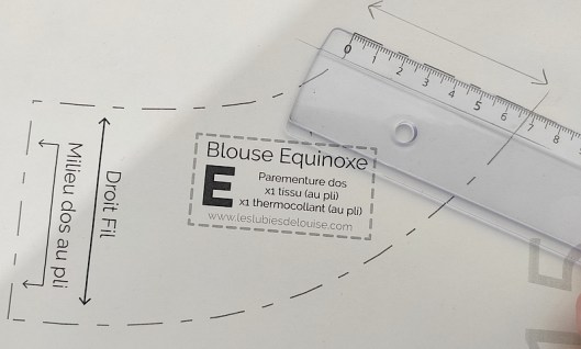Une fois la nouvelle ligne tracée, il convient ensuite de dessiner la nouvelle parementure devant. A noter que la ligne de raccord (épaule) avec la parementure dos est plus longue que les 6 cm indiqués dans les explications. C’est donc une mesure que j’ai modifiée sur ma pièce parementure devant. J’ai eu quelques échanges à ce propos avec Louise qui a été hyper réactive et disponible (c’est vraiment une créatrice au top !). C’est donc un point qui sera revu et donc rectifié tout prochainement.