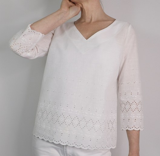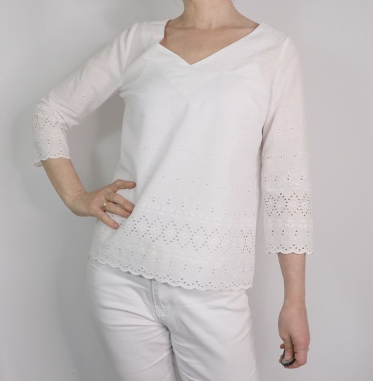 J’ai cousu ma version dans un joli coupon qu’une collègue m’a offert : un voile de coton dont une partie est en broderie anglaise et dont les bords sont festonnés. J’adore !