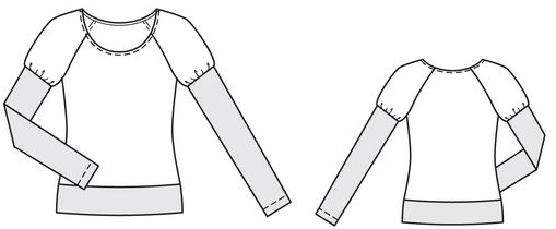 Il s’agit d’un t-shirt dont les manches longues ajustées sont rapportées aux manches courtes de type ballon et raglan, façon trompe-l’œil. L’encolure est ronde et le bas du t-shirt est fini par une bande de taille.