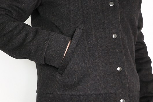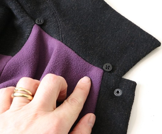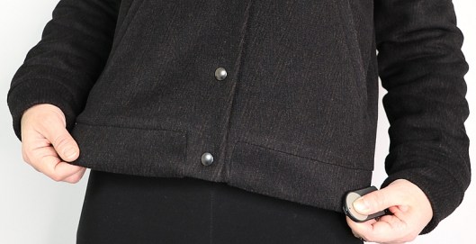 La veste se ferme au milieu devant par une patte de boutonnage à-même. Comme la créatrice, j’ai utilisé des boutons pressions et comme d’habitude, j’ai prix ceux de la marque Prym (anorak, diamètre 1,2 cm).