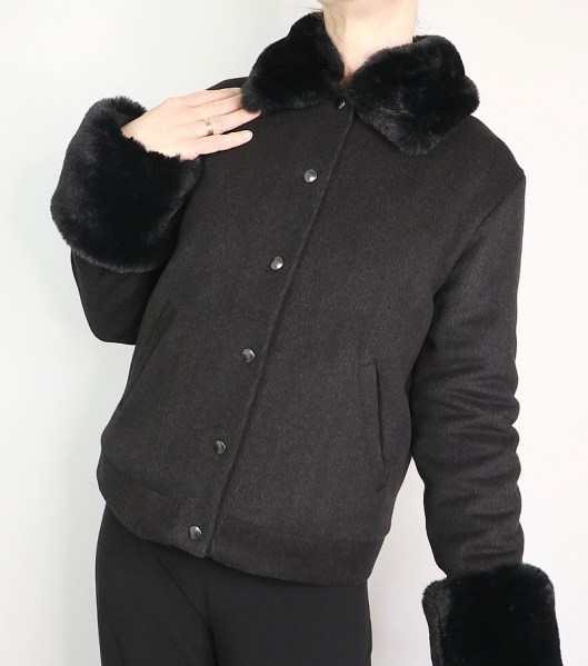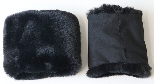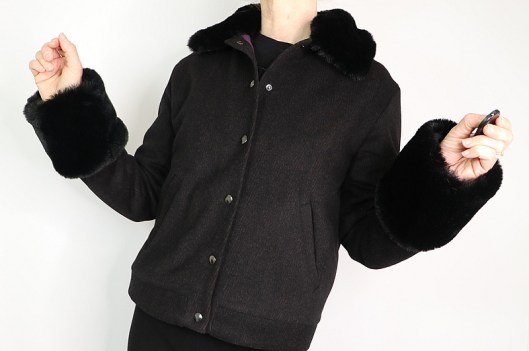 Puisqu’il me restait de la fausse fourrure (la laize étant de 150 cm !), je me suis dit que j’allais coudre des manchons coordonnés histoire d’avoir un total look blouson d’hiver ! Ce petit rappel du col au bas des manches ne me plait au final pas du tout : j’ai en effet mal géré les proportions… Je les trouve trop imposant et ça manque donc je trouve d’élégance…