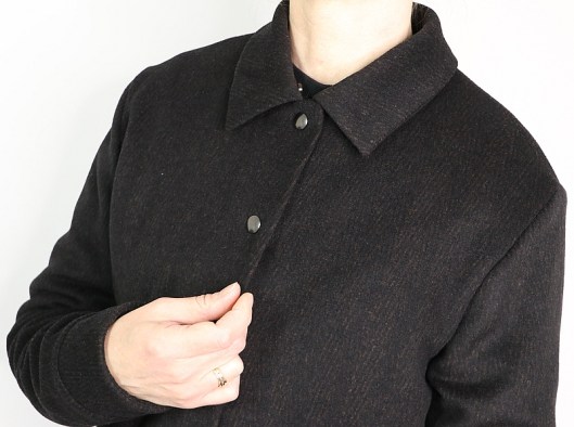 Côté tissus, le métrage nécessaire va de 1m40 à 1m90 selon la taille choisie (laize 140 cm). J’ai choisi de coudre ma version dans un lainage mélangé que j’ai acheté dans la boutique Toto Tissus (Paris/Réaumur) à 8,90€/m si mes souvenirs sont bons. C’est un tissu noir avec des traits marrons plutôt discrets.