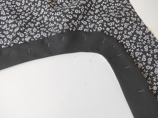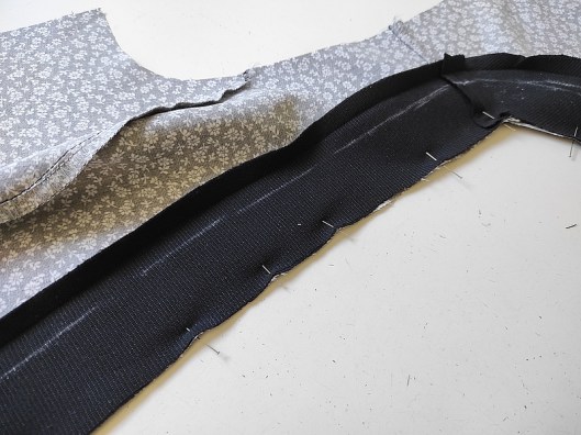 J’ai ensuite positionné puis épinglé la parementure sur l’endroit du vêtement en pressant bien le tout au fer. Vous remarquerez au passage que je travaille à plat (avant d’effectuer la couture des côtés), ce qui facilite grandement les choses.
