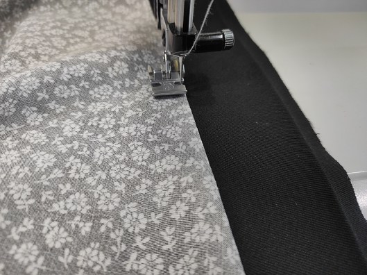 Une fois la parementure assemblée, j’ai effectué ensuite une sous-piqûre pour que la parementure vienne bien se positionner sur l’intérieur du corsage. J’utilise ici mon pied de biche pour zip (et je décale l’aiguille vers la droite) que je trouve bien pratique pour ce genre de piqûre près d’un bord :