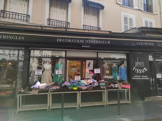 Tout d’abord, ma version est bicolore. J’avais trouvé cette viscose chez Tissus Reine (5,90€/m) et comme je trouvais l’imprimé assez chargé, j’avais peur qu’on ne voit pas tous les jolis détails de ce patron comme la taille et la coupe cache-cœur du corsage. Du coup, j’ai associé cet imprimé à un polyester noir (10€/ 3 mètres) que j’avais acheté dans la boutique Paris Tissus / Luxor que j’ai découverte récemment dans le quartier de Montmartre (anciennement boutique de bagages/sacs).