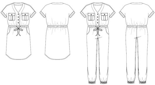 Bref, revenons à Anza… C’est donc un modèle décontracté qui propose une jolie encolure en V fermée par une patte de boutonnage. Les manches à même sont tombantes et finies par un bracelet de manche. Des poches plaquées à rabat sont prévues sur la partie corsage, des poches italiennes sur la partie jupe/pantalon. La combinaison/Robe est resserrée à la taille par une coulisse élastiquée et un lien à nouer. La robe est de longueur genoux. la combinaison est de longueur cheville finie par une coulisse élastiquée.
