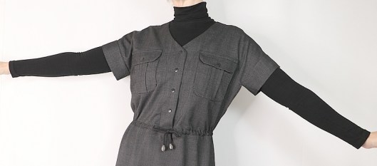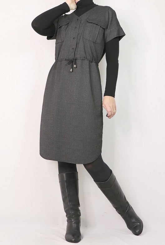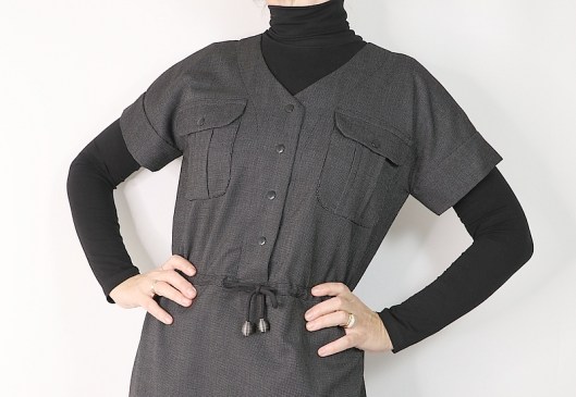 J’aime beaucoup l’allure de cette petite robe que je trouve à la fois sobre et élégante. Je la porte ici avec un sous-pull col roulé, des collants et des bottes. La longueur de la jupe est comme j’aime, bref… c’est le look parfait d’une secrétaire (ça tombe bien, c’est ce que je fais dans la vraie vie !).