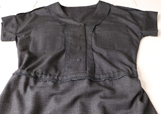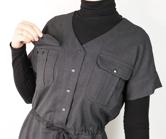 Les instructions de montage nous indique d’assembler le devant et le dos du corsage par la couture des épaules puis de faire la finition de l’encolure (parementure) et ensuite seulement de coudre les poches positionnées au niveau de la poitrine. Perso, j’ai préféré faire l’inverse, à savoir d’abord coudre les poches sur le devant avant d’assembler le corsage. On a ainsi plus de facilité pour les positionner/coudre sur le corsage.