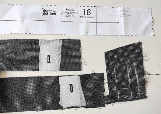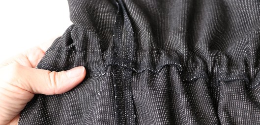 Une fois la coulisse correctement cousue, on vient la surpiquer en place en veillant à laisser un espace pour pouvoir insérer un élastique. Perso, je n’ai pas bien compris pourquoi on ne passait pas directement l’élastique par les boutonnières… J’ai pourtant utilisé un élastique de 0,6 cm de large comme recommandé et ça passe très bien…