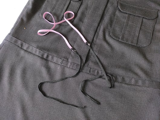 1/ Je n’ai pas cousu le lien à nouer dans le tissu de la robe (une pièce patron est prévue pour), j’ai en effet préféré prendre un cordon du commerce. Pour info, j’ai cousu le cordon directement à l’élastique. Le livret technique prévoit en effet de mettre un élastique qui fait tout le tour de taille. Les liens à nouer étant purement décoratifs car on vient juste les positionner au niveau des boutonnières.