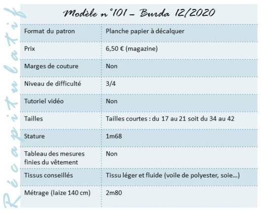 J’avais acheté il y a quelques temps de ça le patron n°101 du magazine Burda de décembre 2020 sur le site russe de Burda (à l’époque où on pouvait encore le faire), du coup les explications sont en russes, donc incompréhensibles… J’ai donc à nouveau fait appel à Zélie Décousue (l’initiatrice du défi Burda) pour qu’elle me transmette les instructions de montage en français. Ce qu’elle a fait avec beaucoup de gentillesse et de rapidité et je l’en remercie grandement ! A la lecture des explications, je vite compris que j’allais coudre cette blouse à ma sauce d’autant plus que je prévoyais d’y apporter quelques modifications majeures… Si vous souhaitez coudre ce modèle tel quel, sachez que le niveau de difficulté annoncé est de 3/4, ce que je confirme !