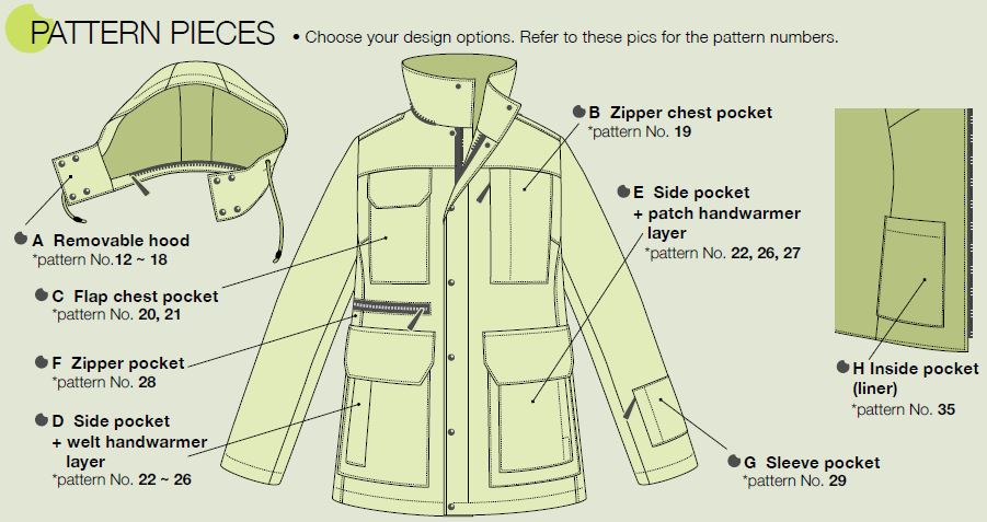36 pièces composent ce patron. Ci-dessous, les pièces qui concernent la veste principale :