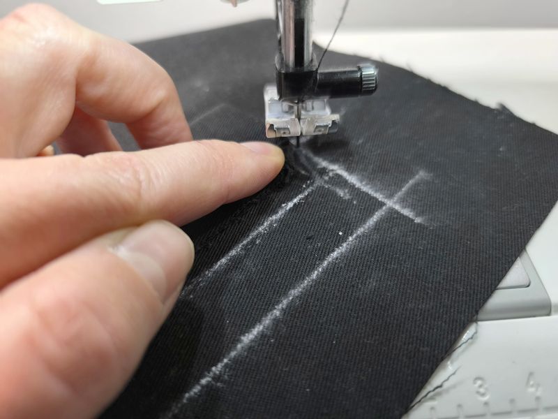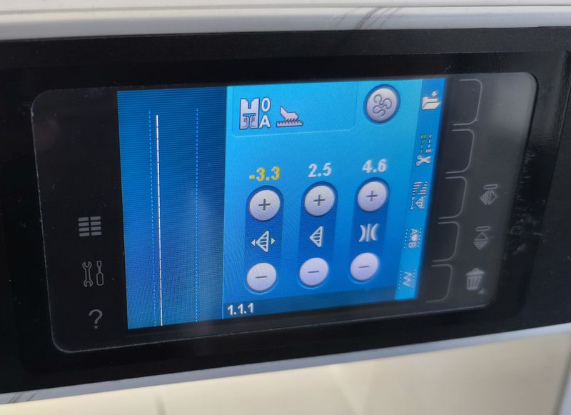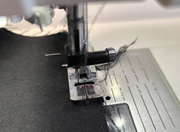 Comme indiqué plus haut, j’ai imprimé ce patron au format A0. Les marges de couture sont incluses mais attention car elles sont de 1,2 cm ! Pour coudre à la bonne distance, j’ai repéré à quel endroit il fallait positionner l’aiguille par rapport au bord du mon tissu. Avec ma machine Pfaff, on peut décaler l’aiguille sur la gauche ou sur la droite, c’est donc ce que j’ai fait.