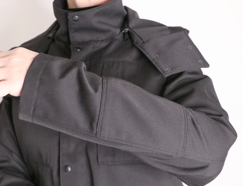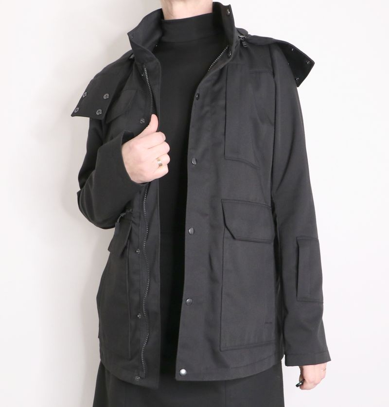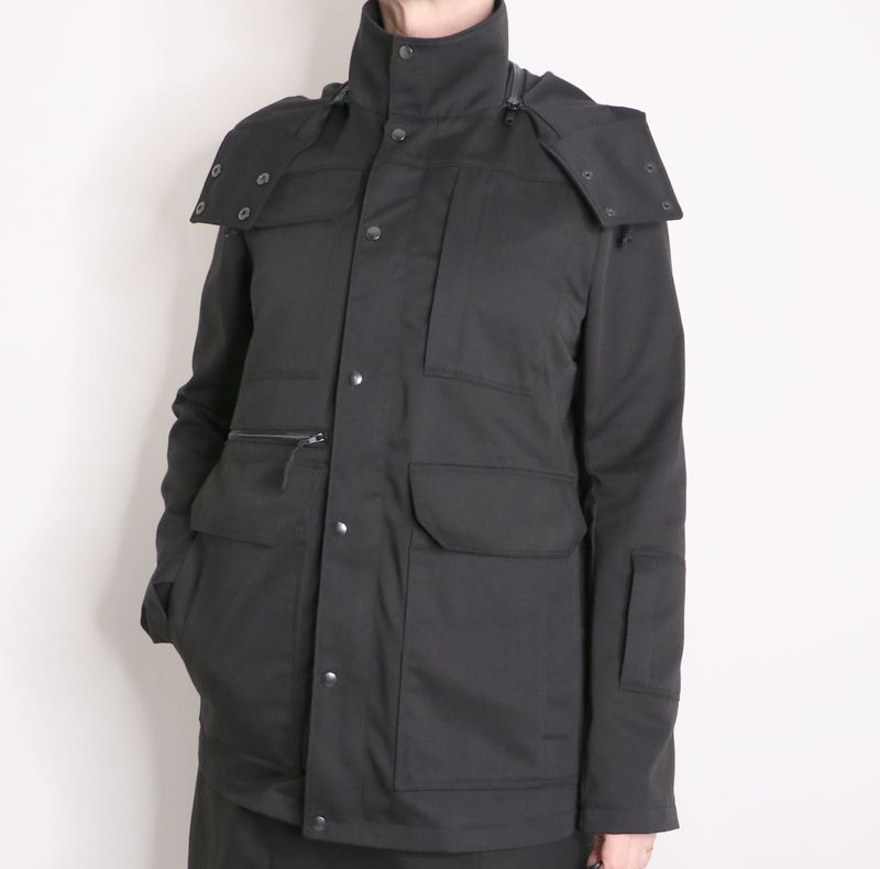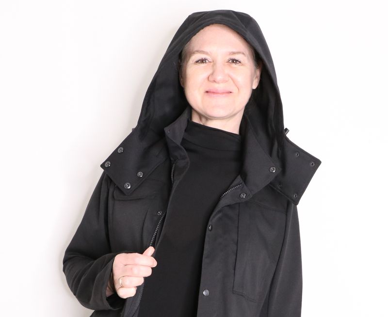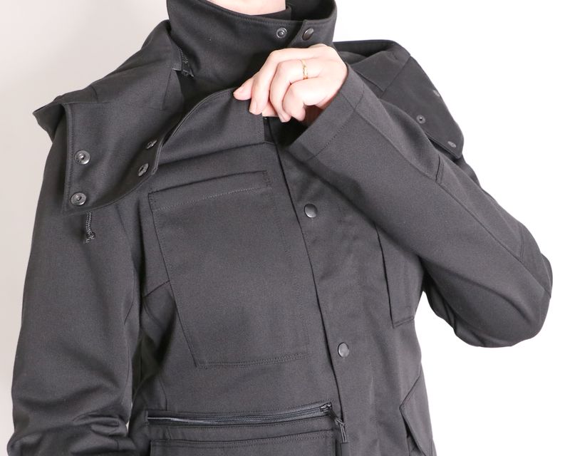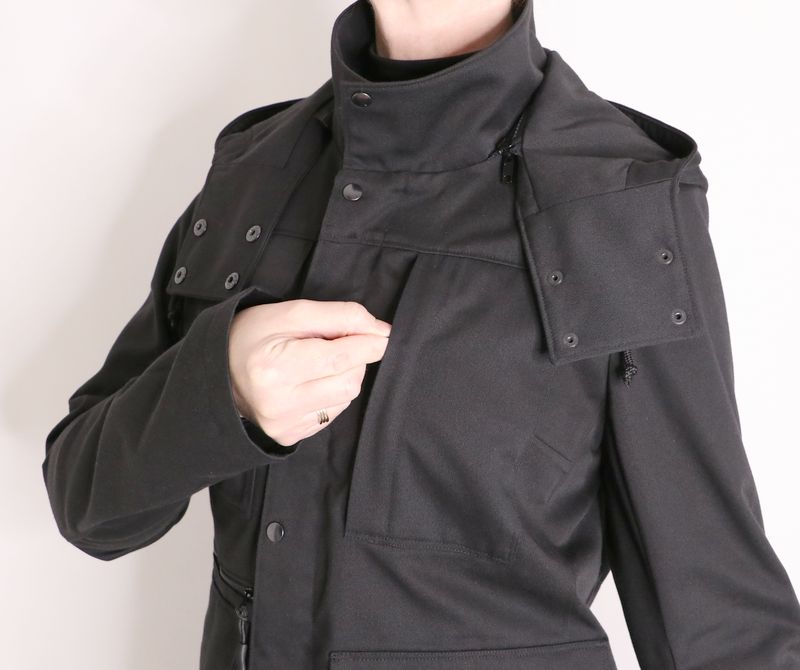 Kikyo est une ingénieuse veste 3 en 1 : une veste avec capuche amovible et avec également une doublure amovible. La veste, pourvue d’un col montant, est de coupe « loose-regular ». Elle se ferme au milieu devant par un zip et une patte de boutonnage avec boutons pressions. Cette veste est dotée de nombreux détails comme des plis aux coudes, une ceinture au dos pour ajuster la taille et une multitude de poches : poches plaquées, poches zippées et poches passepoilées.