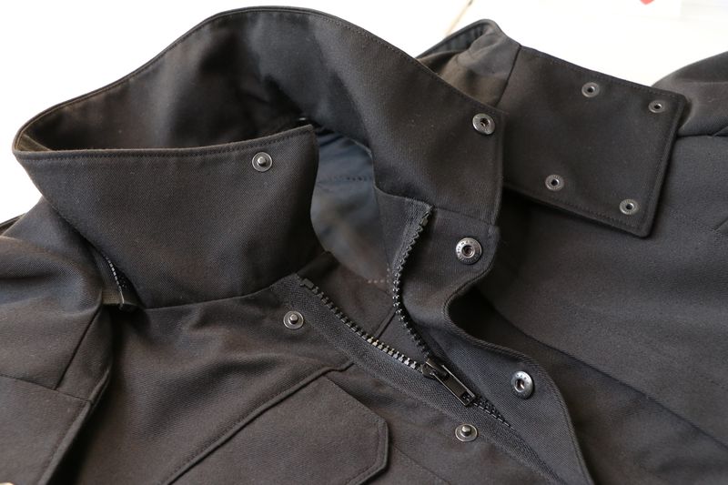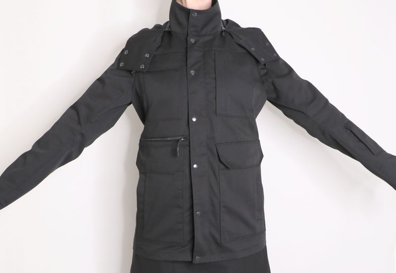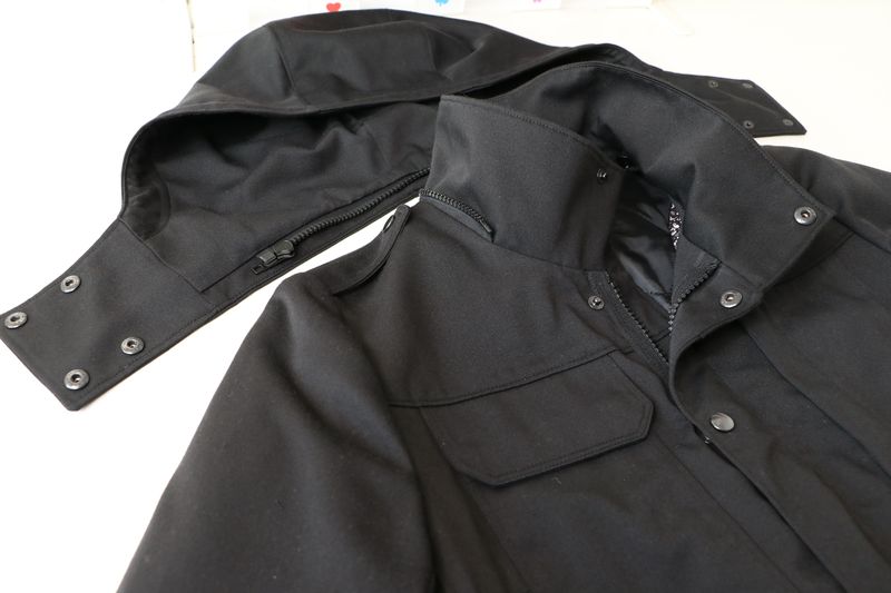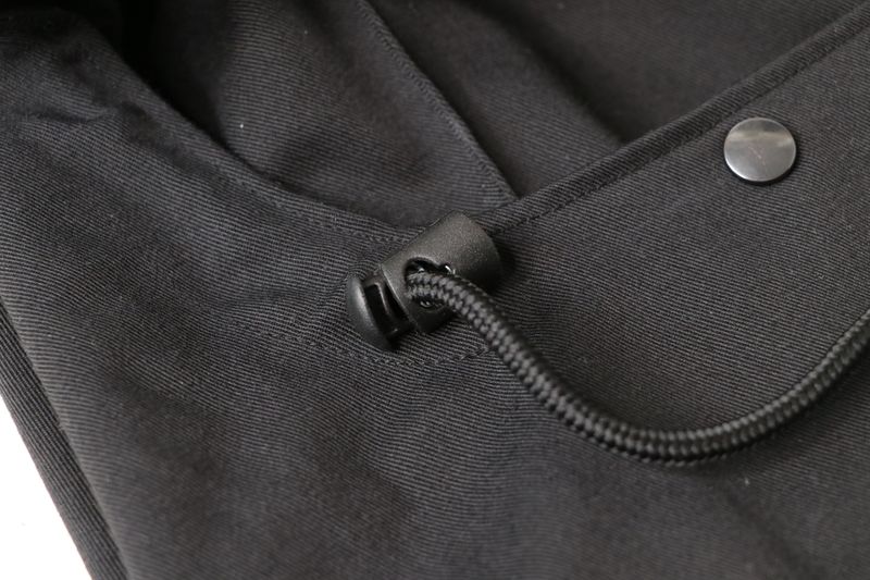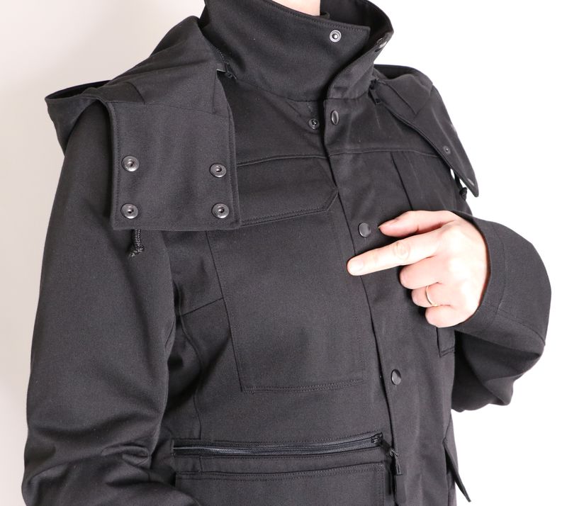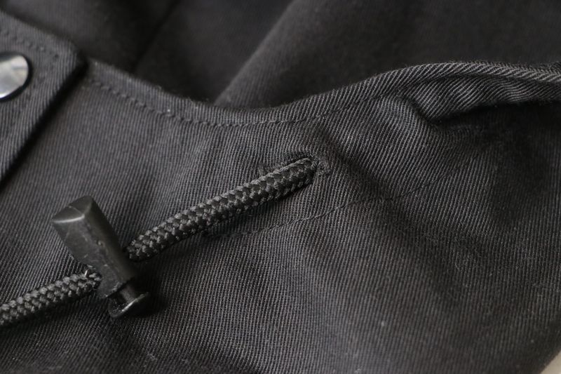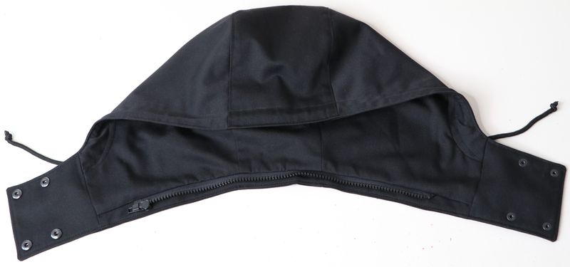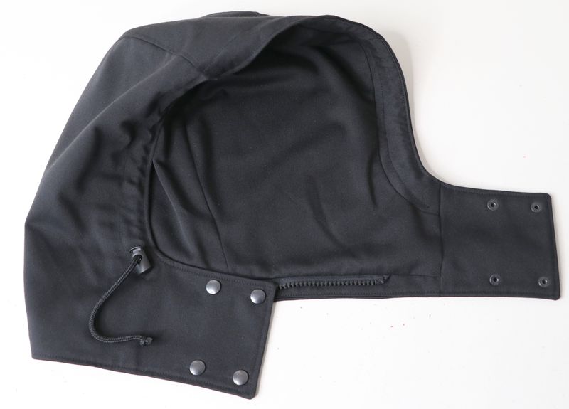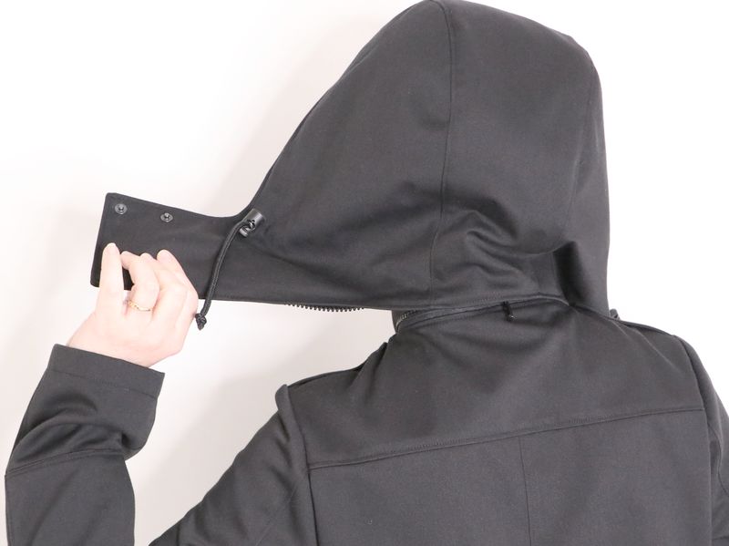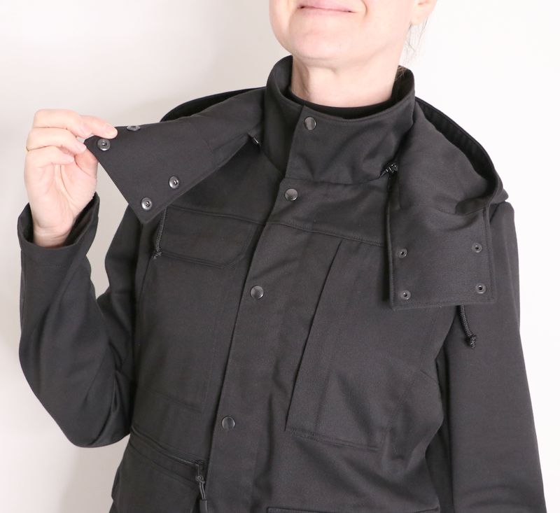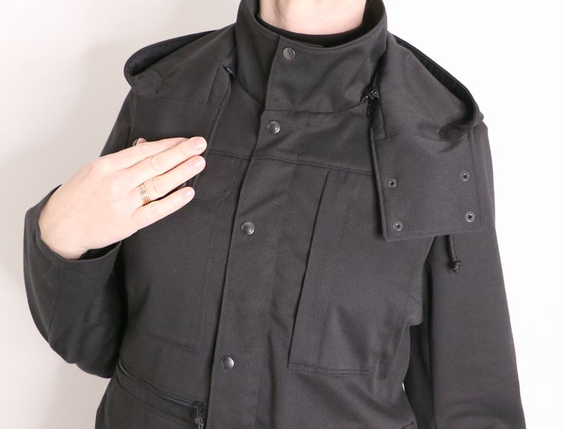Le haut de la veste est pourvue d’un col montant et d’une capuche amovible :