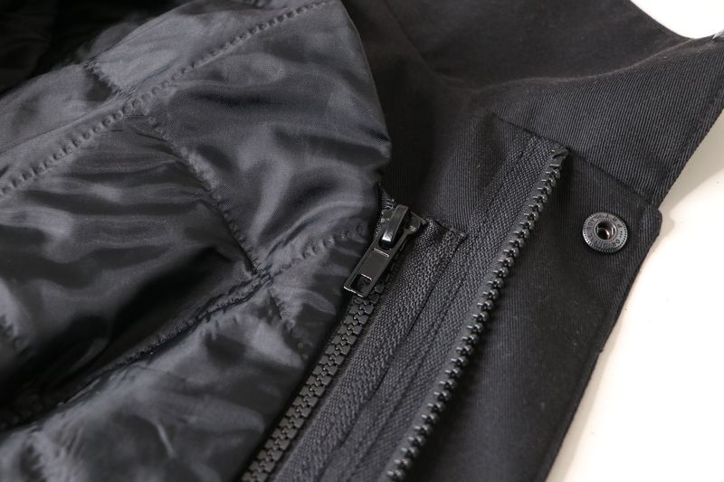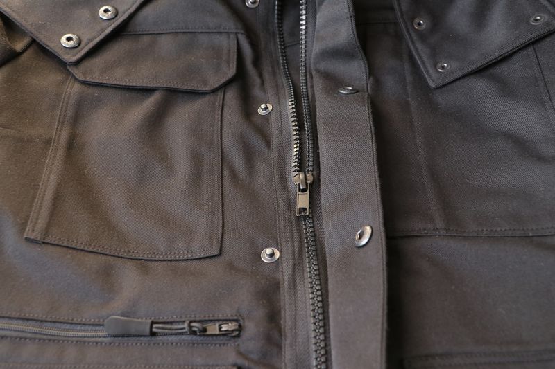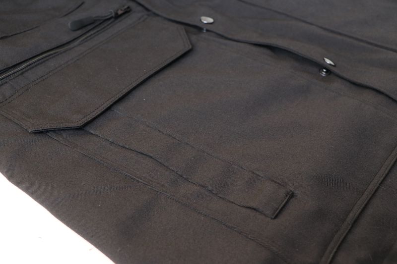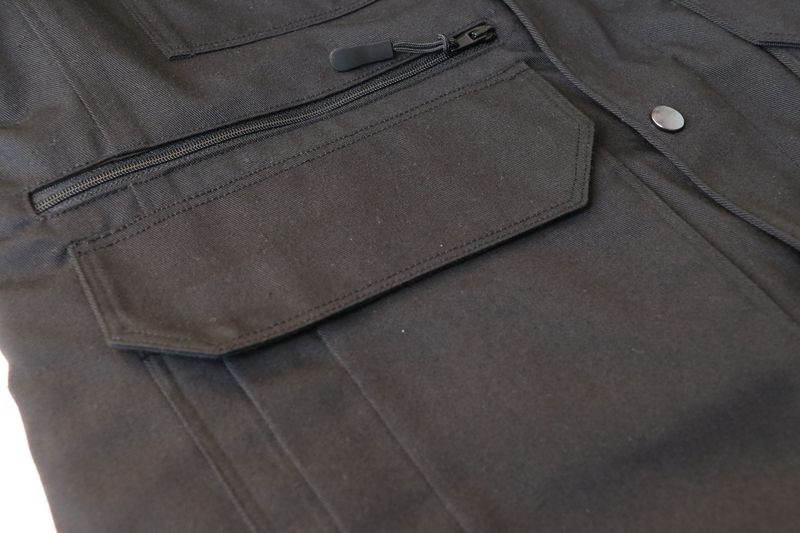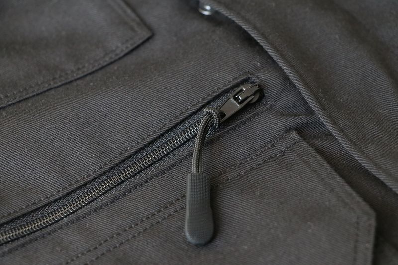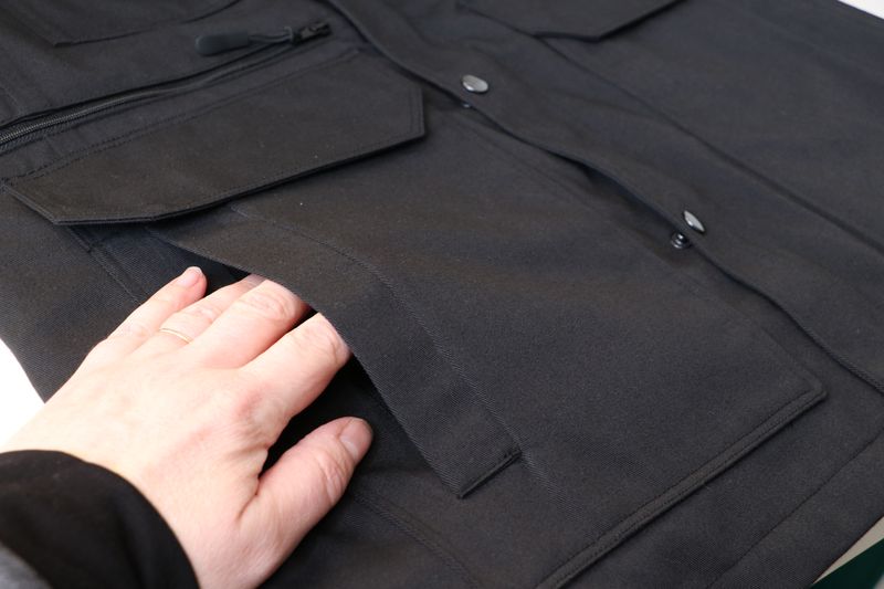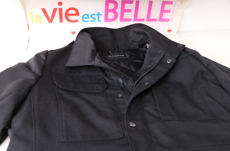 La veste se ferme au milieu devant par un zip et une patte de boutonnage avec boutons pressions.