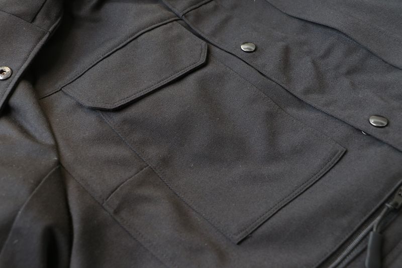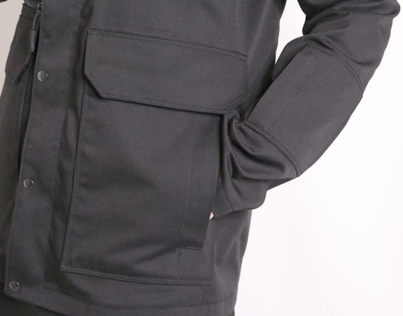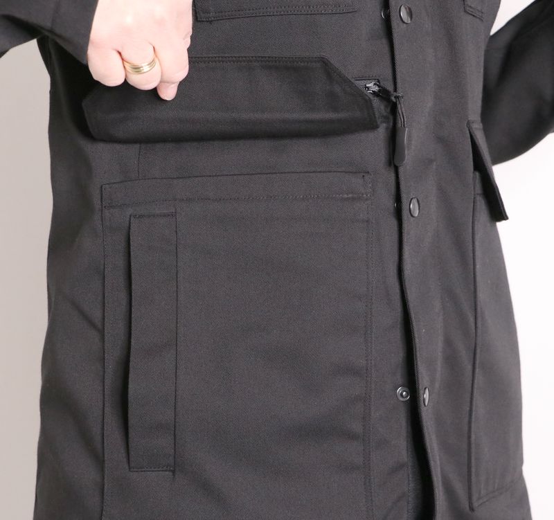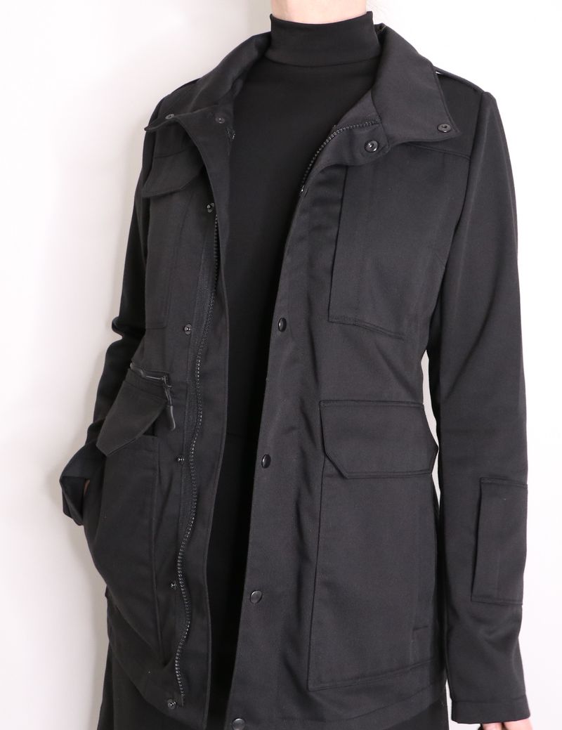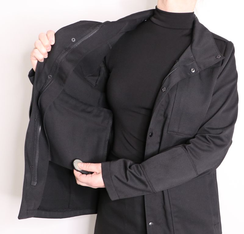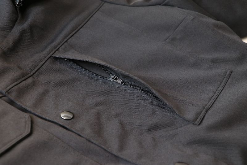 La veste se ferme au milieu devant par un zip et une patte de boutonnage avec boutons pressions.