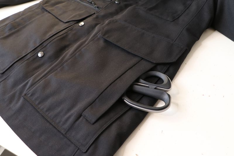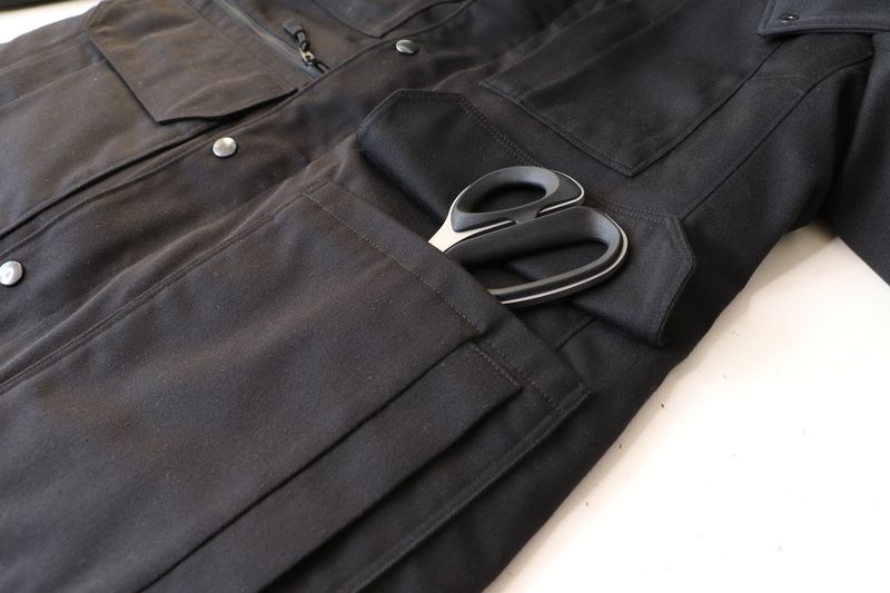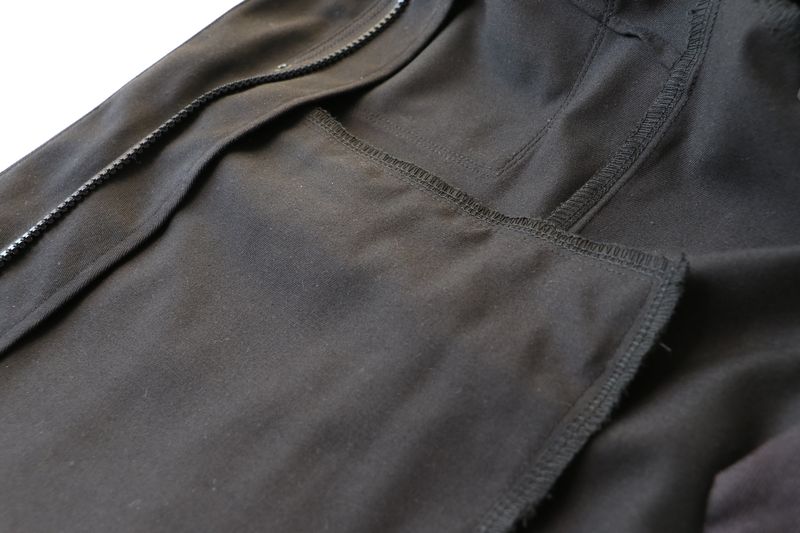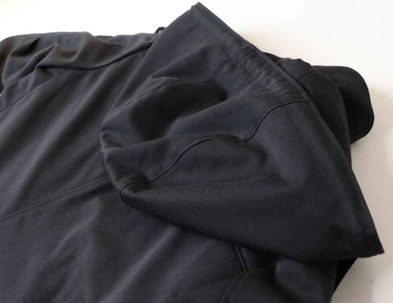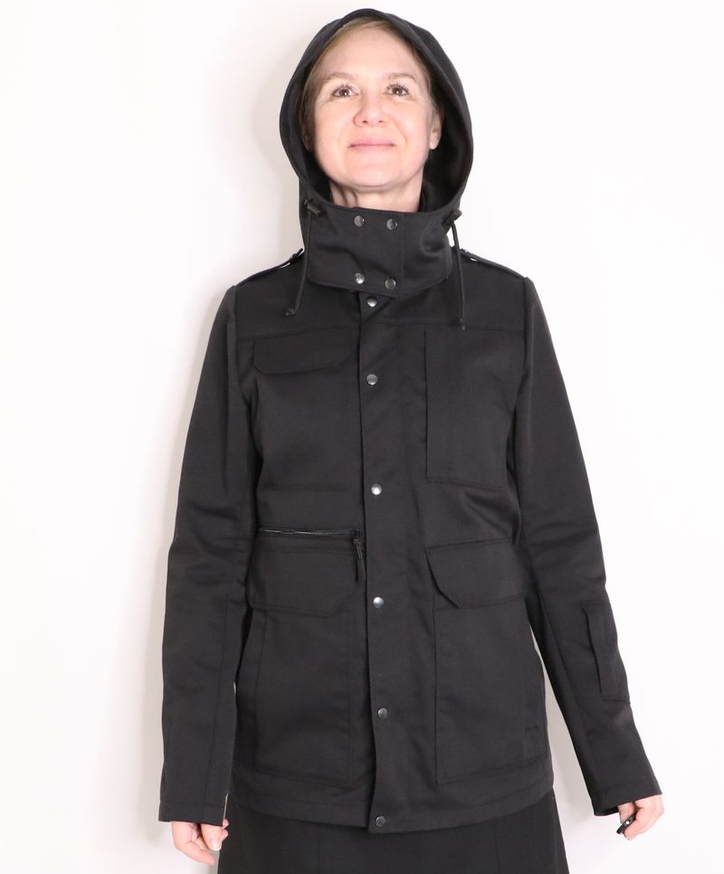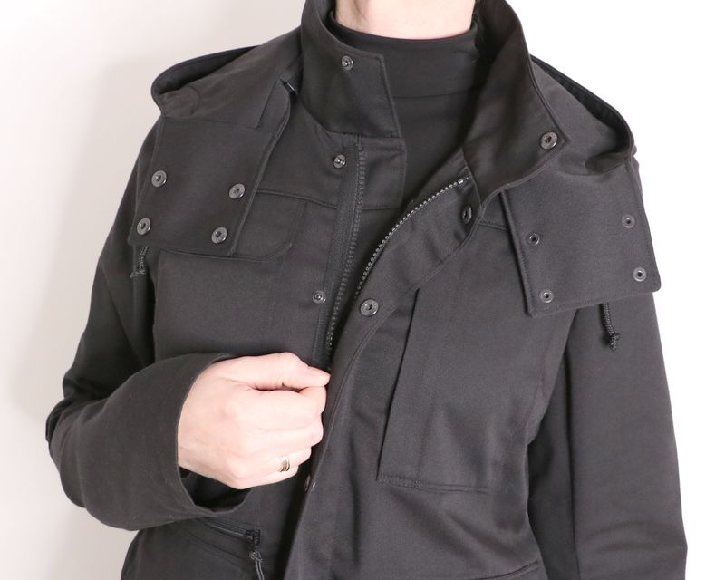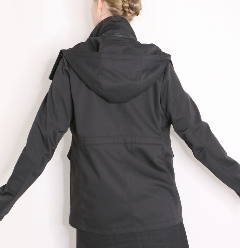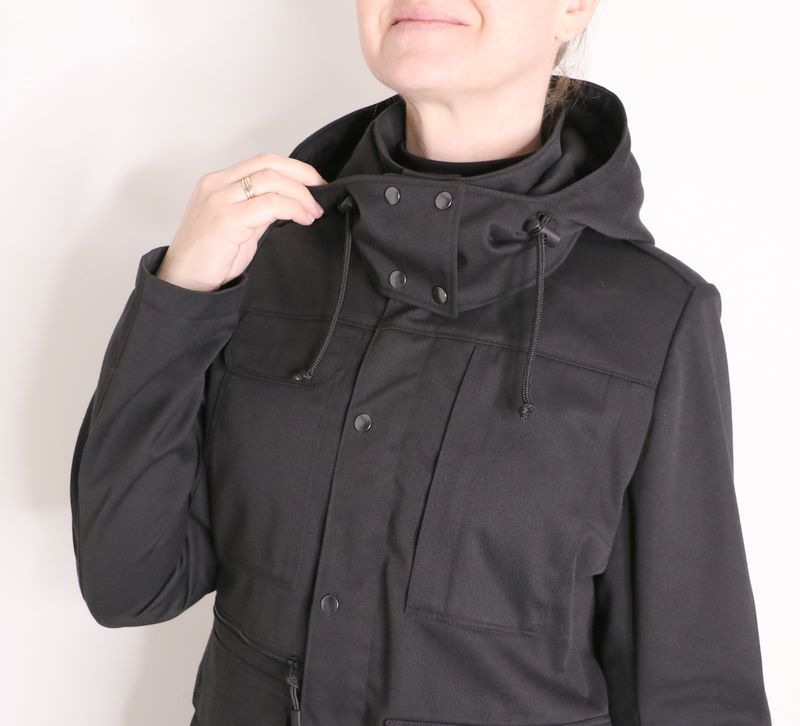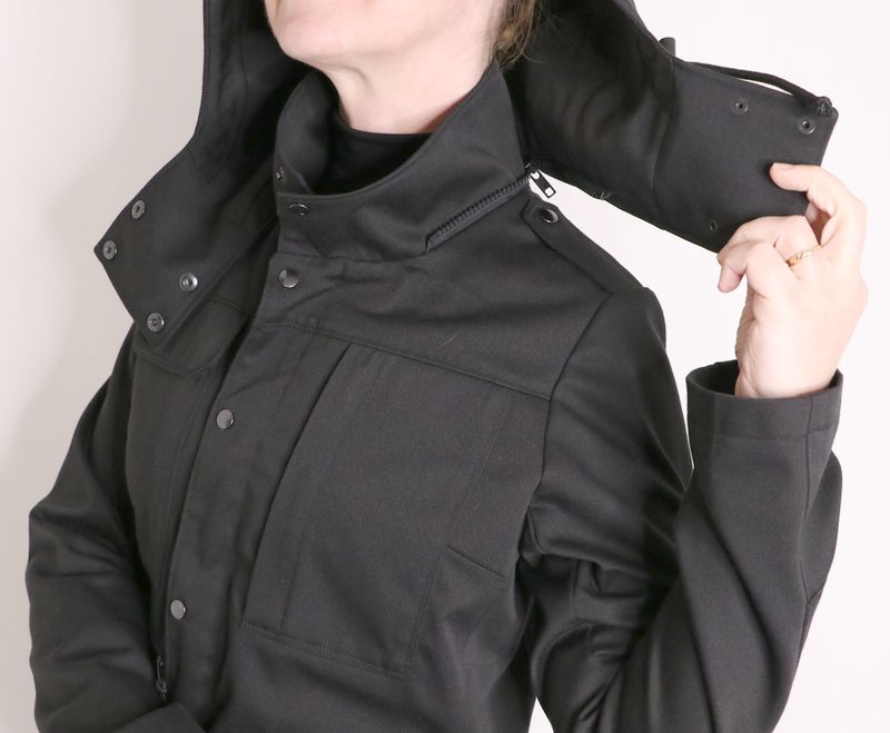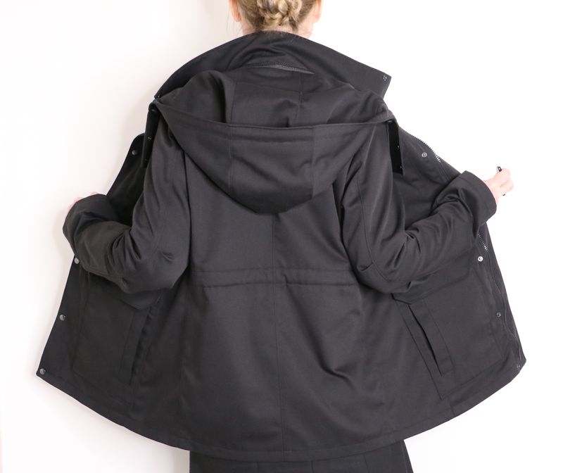 Côté tissus, j’ai opté pour cette gabardine de coton & polyester noire achetée dans la boutique les Coupons de Saint-Pierre (20€ / 3 mètres). Je l’ai trouvée parfaite pour ma veste car c’est un tissu qui ne se froisse que très peu et qui sèche vite. J’aurais pu opter pour une veste avec tissu déperlant mais j’en avais déjà une dans ma garde-robe : la veste Joy de Chalk & Notch que j’adore mais qui a été une misère à coudre et dont les propriétés « déperlantes » ont totalement disparues avec le temps…