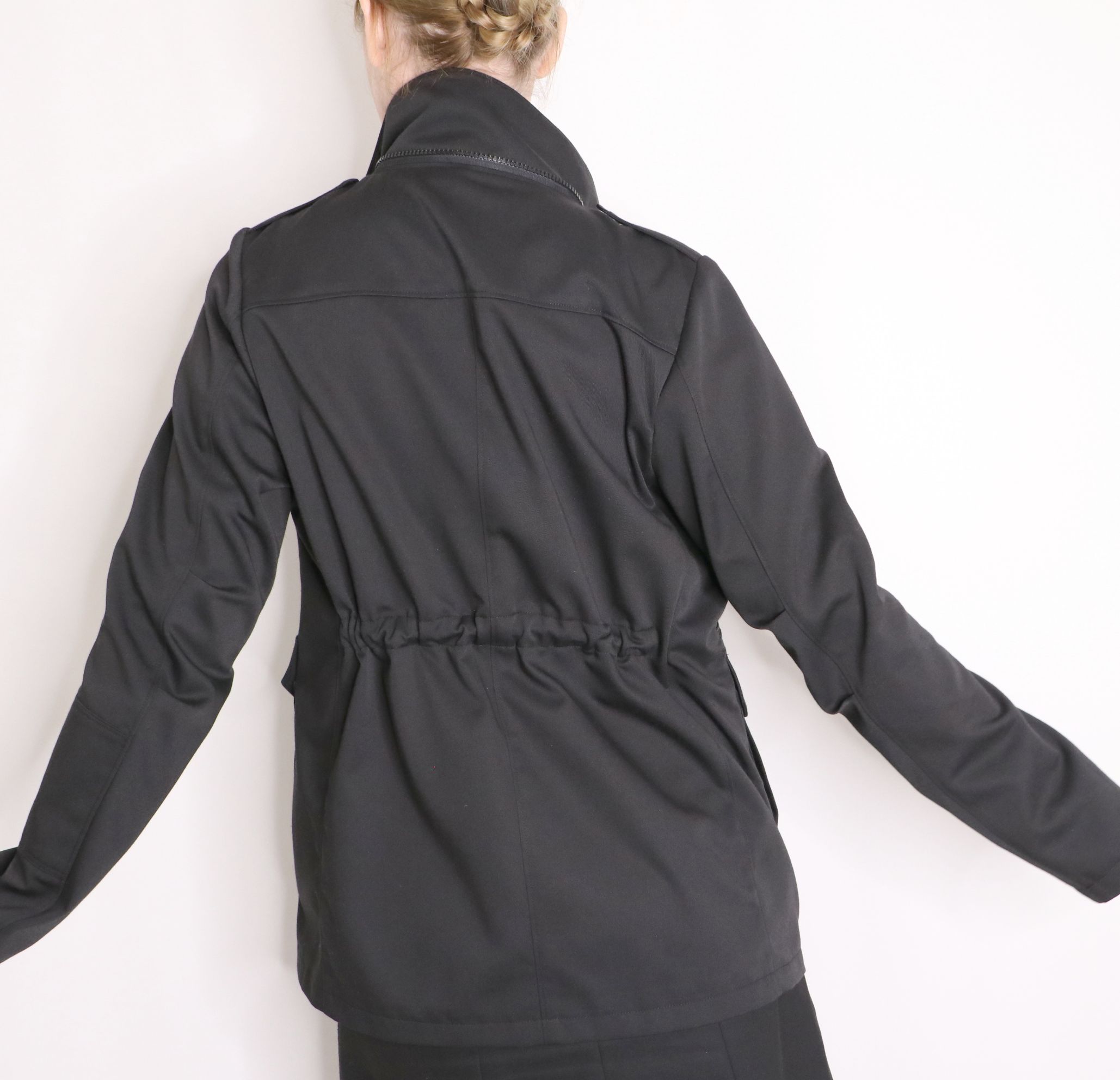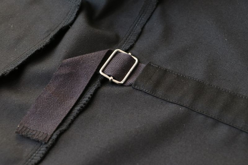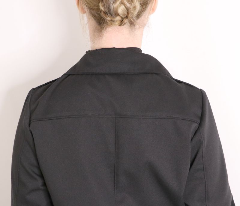Le dos est simple mais néanmoins pourvu d’un empiècement et d’une ceinture de réglage à la taille pour cintrer ou pas la veste :