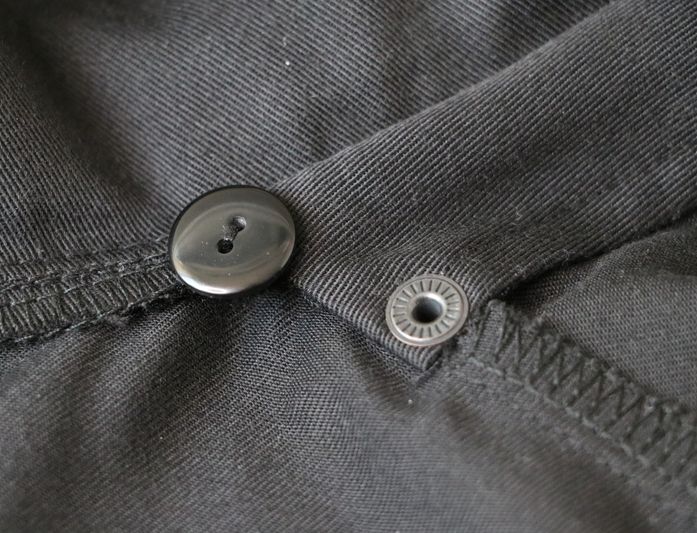 J’ai opté pour des pressions anorak noires de la marque Prym. Ca fait des années que je les utilise, elles sont faciles à installer, elles sont pratiques au quotidien et tiennent vraiment bien dans le temps.