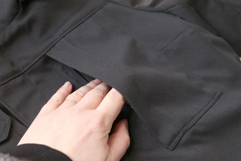 La seule poche que je n’ai pas cousue est la poche plaquée H prévue sur la doublure amovible. J’avais en effet peur de créer des surépaisseurs inutiles…
