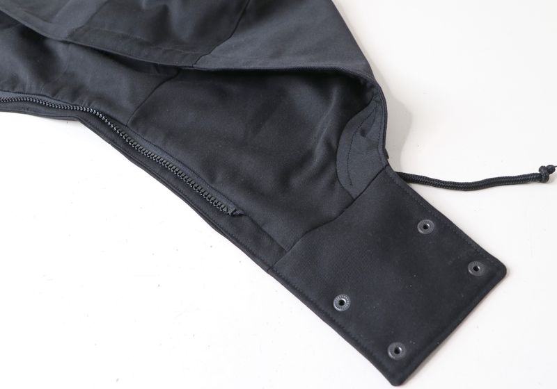 La doublure amovible s’accroche sur la veste principale avec des zips mais aussi avec des boutons & des liens élastiqués positionnés notamment au niveau de l’encolure :