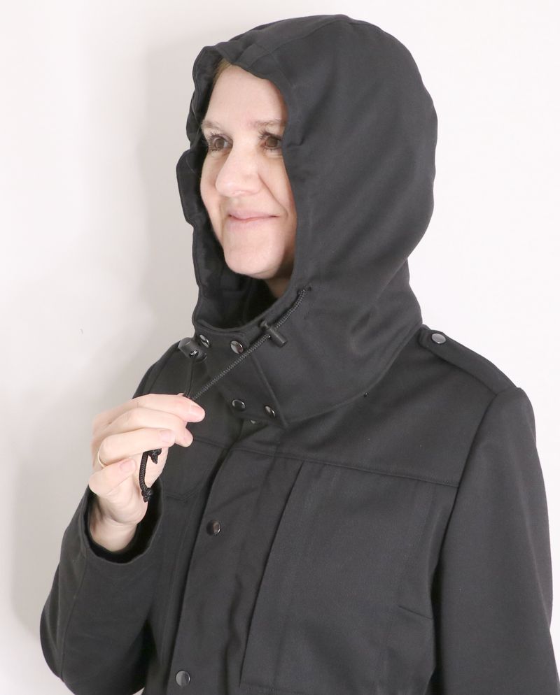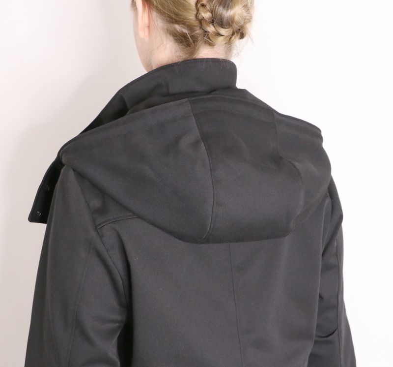 La capuche est doublée (ici dans la même gabardine) :