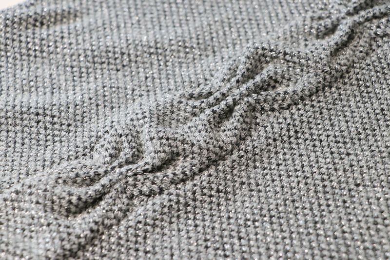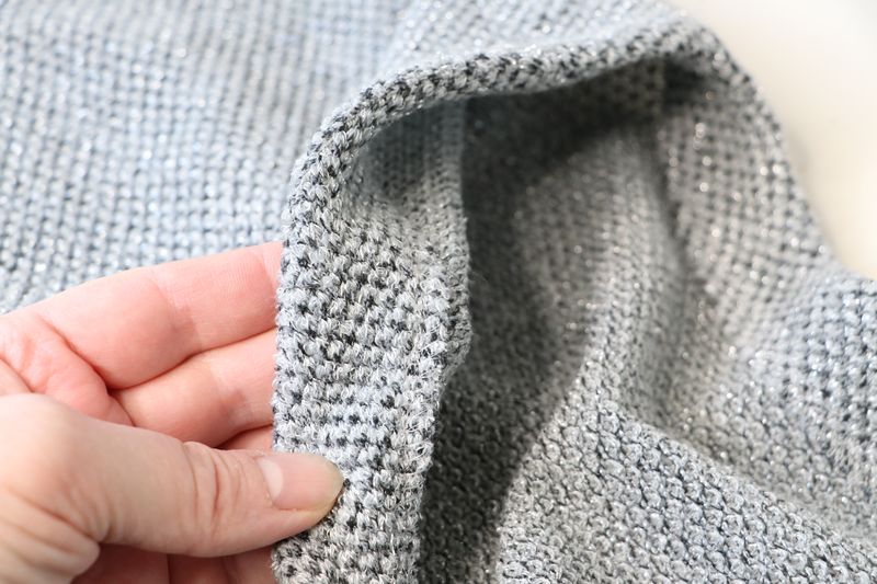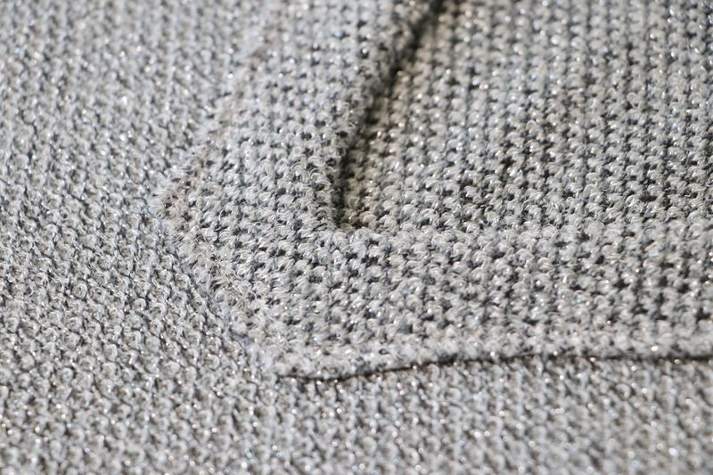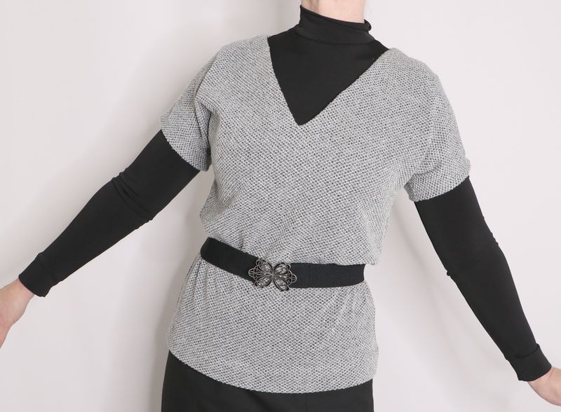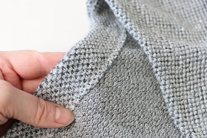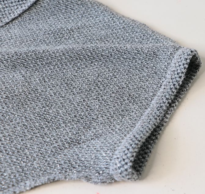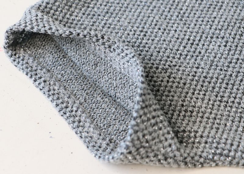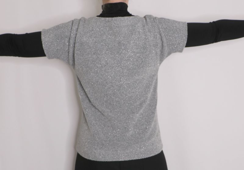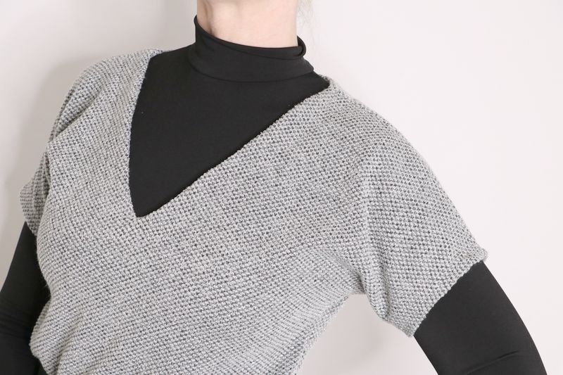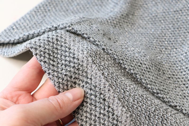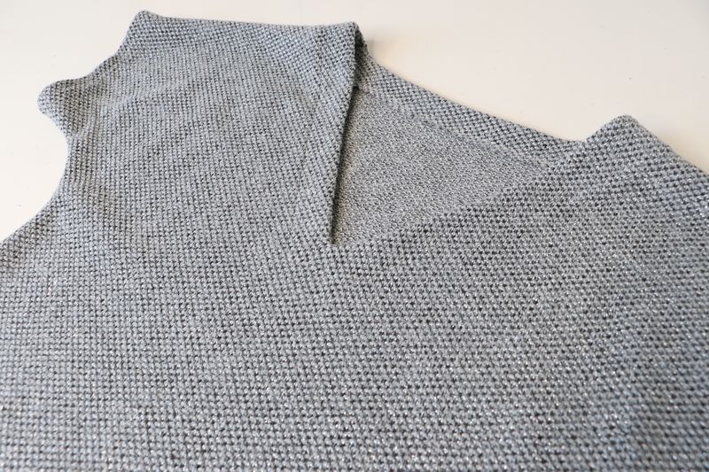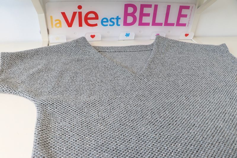 Pour mémoire, voici ce que j’avais cousu dans cette maille grise polyester & lurex achetée dans la boutique Modes & travaux (Les Coupons de Saint-Pierre) : 20 € les trois mètres. Ce n’est clairement pas un tissu qui durera dans le temps : j’ai porté quelque fois mon pull Junon et il y a déjà des fils tirés un peu partout… Mon pull Junon d’Anna Rose Pattern :