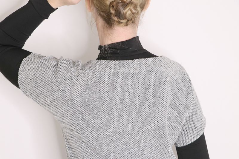 Et pour ma 5ème version, j’avais cousu ce pull en maille avec un joli décolleté en V au devant mais aussi au dos. Un pull cintré à la taille et aux manches longues. Pour arriver au résultat que j’avais en tête, j’avais là aussi procédé à de nombreuses modifications que je vous laisse aller découvrir dans cet article.