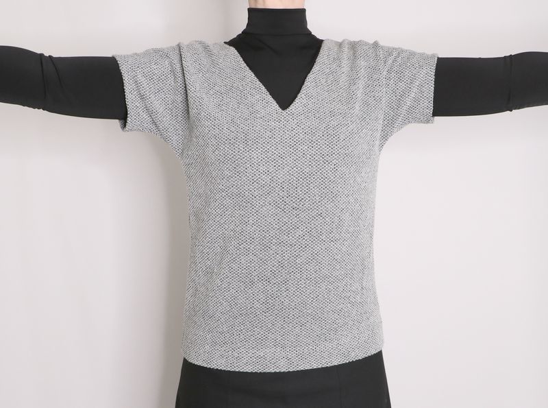 Dans les chutes de ce tissu, j’ai donc cousu un pull, cousu d’après le patron Trop-top d’Ivanne Soufflet qui est une très bonne base de départ. C’est un patron qui commence à dater puisqu’il est sorti en 2015, il y a donc déjà 10 ans ! C’est ici la version A que j’ai choisie, c’est à dire celle pour tissu extensible (jersey/maille).