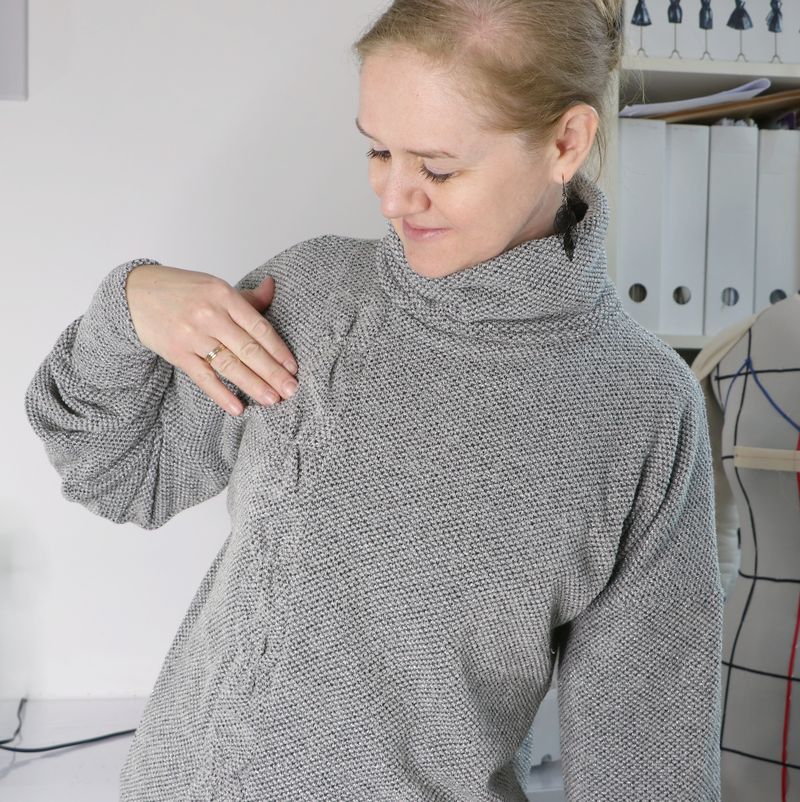 Et pour ma 5ème version, j’avais cousu ce pull en maille avec un joli décolleté en V au devant mais aussi au dos. Un pull cintré à la taille et aux manches longues. Pour arriver au résultat que j’avais en tête, j’avais là aussi procédé à de nombreuses modifications que je vous laisse aller découvrir dans cet article.