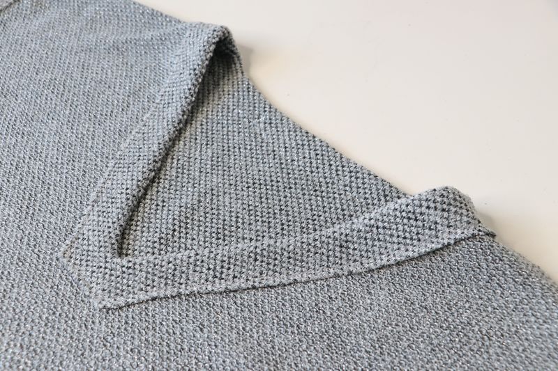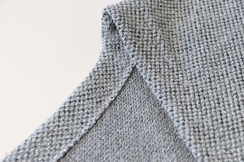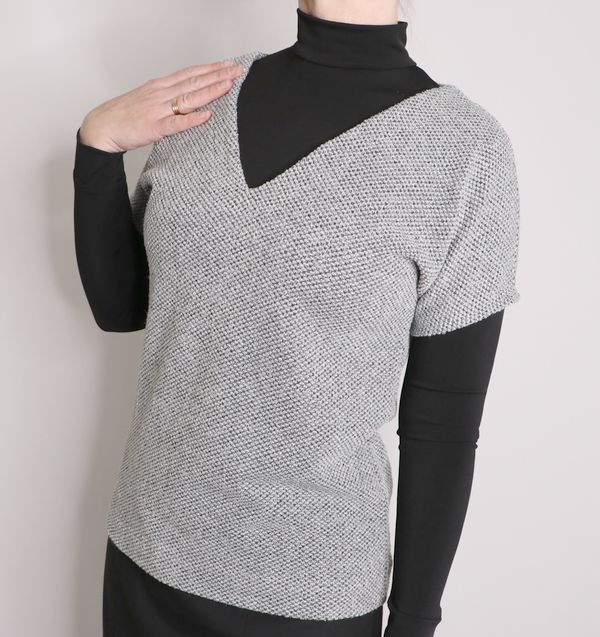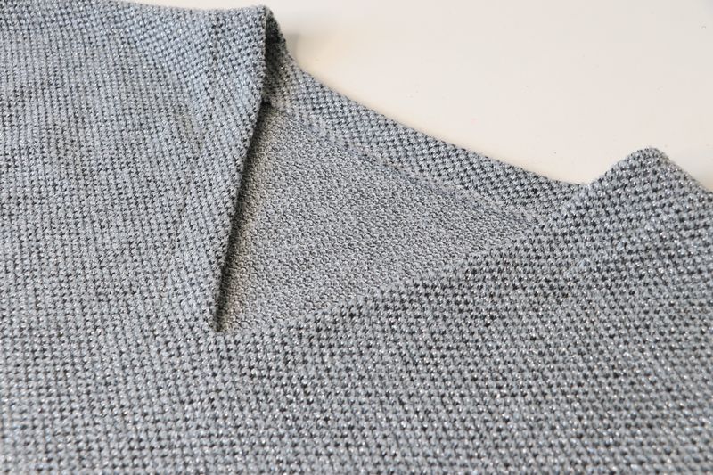 Pour mémoire, voici ce que j’avais cousu dans cette maille grise polyester & lurex achetée dans la boutique Modes & travaux (Les Coupons de Saint-Pierre) : 20 € les trois mètres. Ce n’est clairement pas un tissu qui durera dans le temps : j’ai porté quelque fois mon pull Junon et il y a déjà des fils tirés un peu partout… Mon pull Junon d’Anna Rose Pattern :