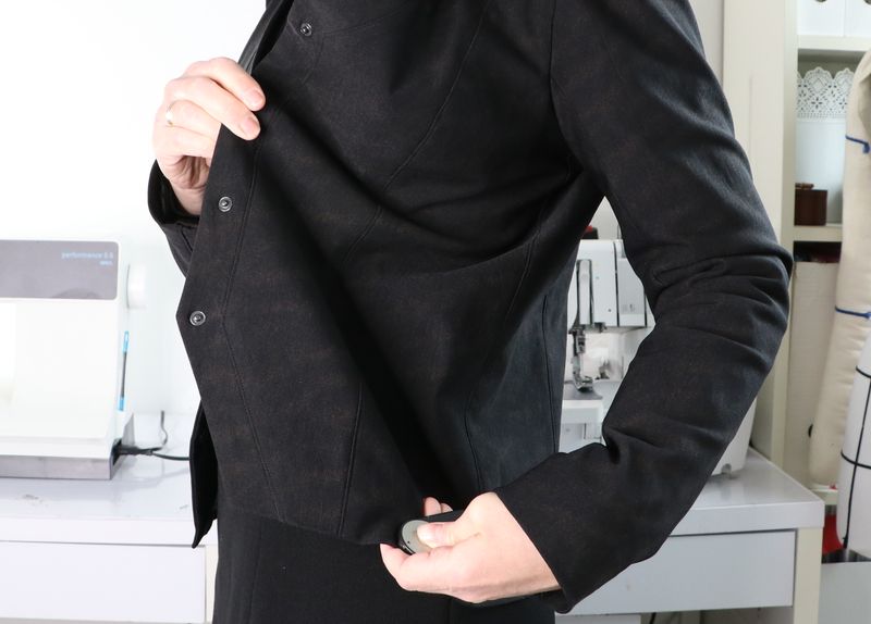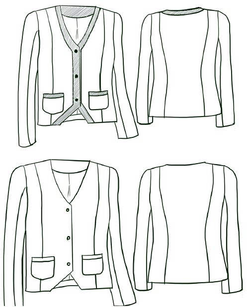 Des poches plaquées sont proposées sur le devant mais je n’avais pas eu envie de les coudre. D’une manière générale, je n’aime pas les poches plaquées pour ce genre de veste, je préfère nettement les poches passepoilées de type raglan…
