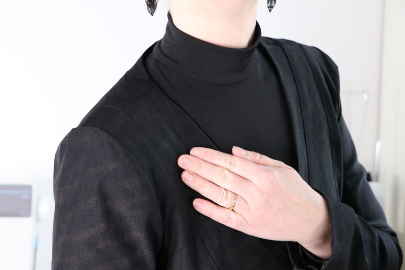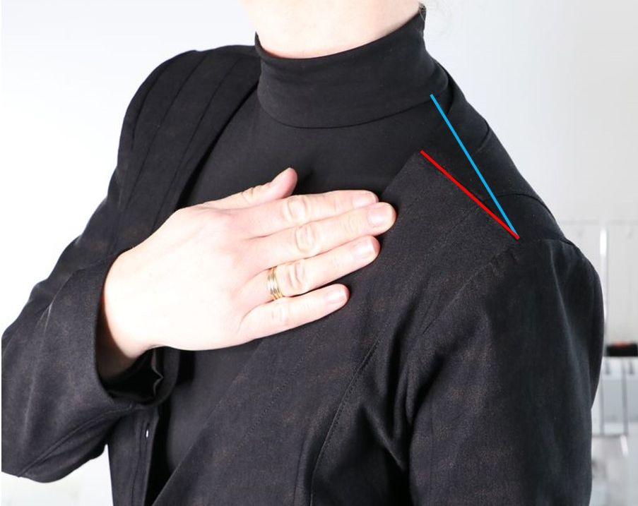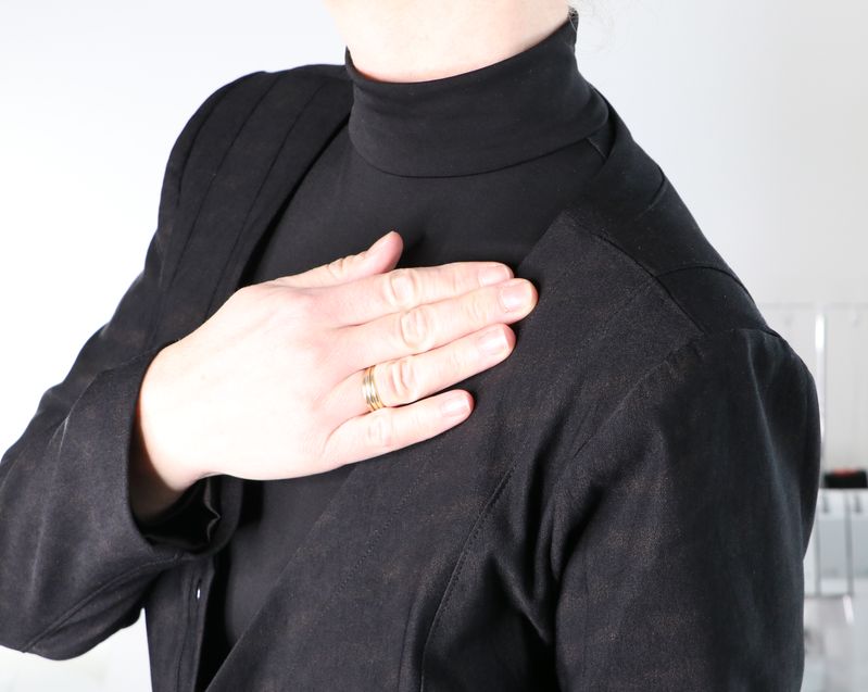 Cependant, cette veste a un défaut : la ligne d’épaule est déportée sur le devant, elle ne se positionne pas correctement. Je pense que c’est lié au tissu que j’ai utilisé qui est trop stretch et qui a donc tendance à se détendre… J’ai en effet utilisé un entoilage léger de type maille mais probablement que j’aurais dû utiliser un entoilage thermocollant plus épais et non extensible… Sur cette photo, on aperçoit la couture d’assemblage de mon sous-pull qui se positionne bien sur ma ligne d’épaule. Le décalage avec celle de ma veste est important…