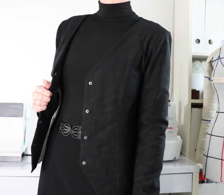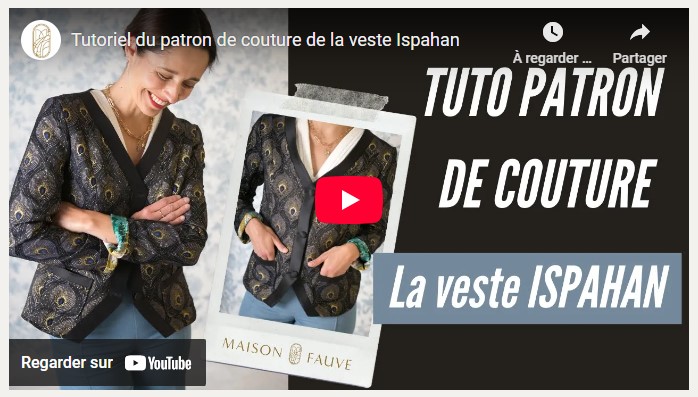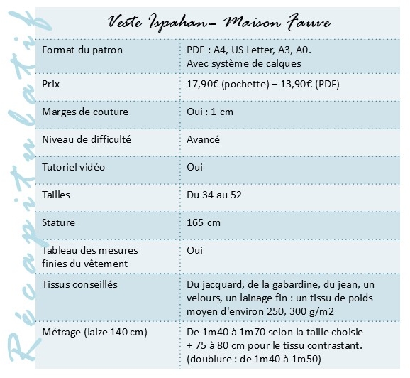 Voici la description de ce patron par Maison Fauve : « ISPAHAN est à mi-chemin entre la veste et le spencer. Le devant est boutonné mais la veste est sans col et elle conserve une allure moderne et structurée grâce à son jeu de découpe devant que vous pouvez souligner ou non avec un empiècement. Sa longueur juste sous la taille la rend plus confortable et facile à vivre. »
