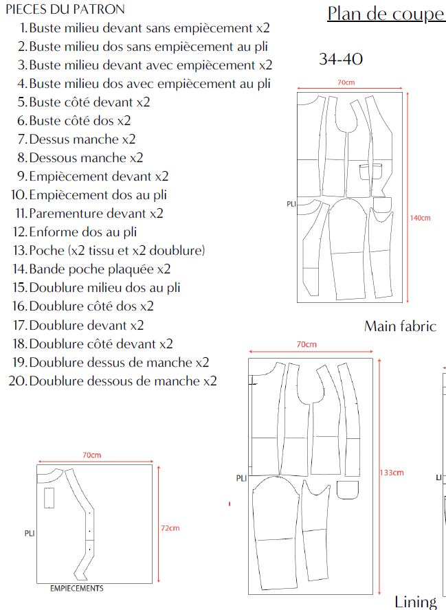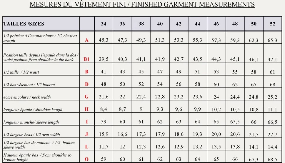 Côté tailles, ce patron est proposé du 34 au 52. Un tableau avec les mesures du vêtement fini est proposé, il nous permet ainsi de voir l’aisance qui a été apportée au modèle.