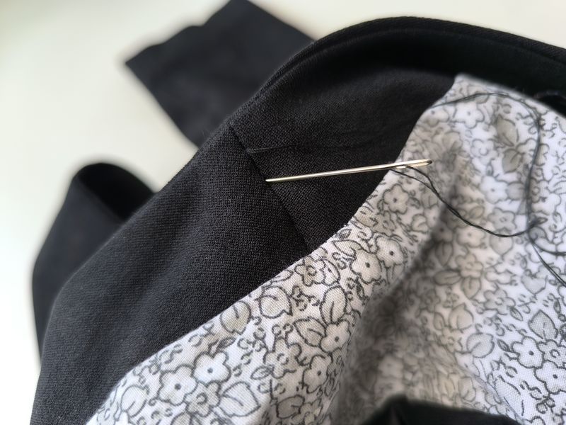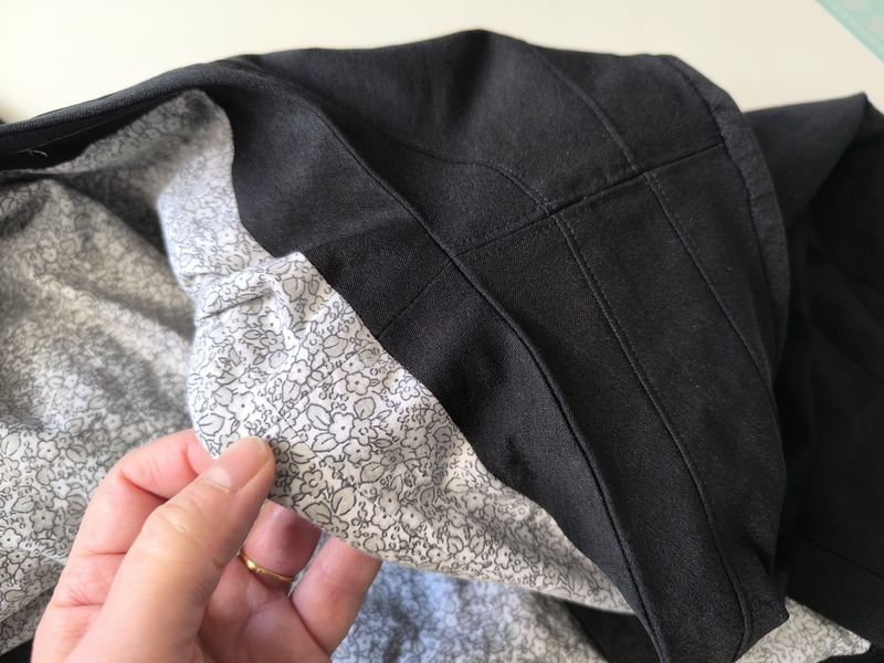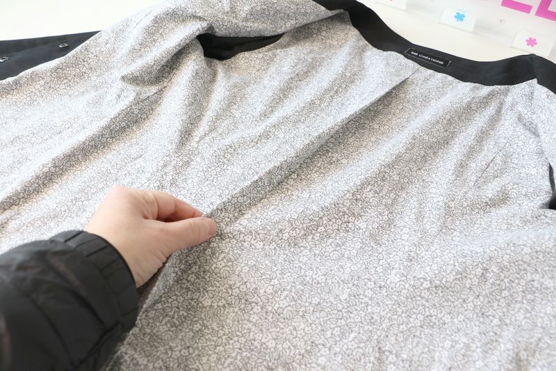 J’ai également décidé de solidariser les deux épaisseurs (doublure + tissu) au niveau des épaules car ça avait tendance à s’ouvrir. Si c’était à refaire, je pense que j’effectuerai au préalable une sous-piqûre tout le long de l’encolure devant et dos afin que la parementure reste bien positionnée sur l’intérieur de la veste.