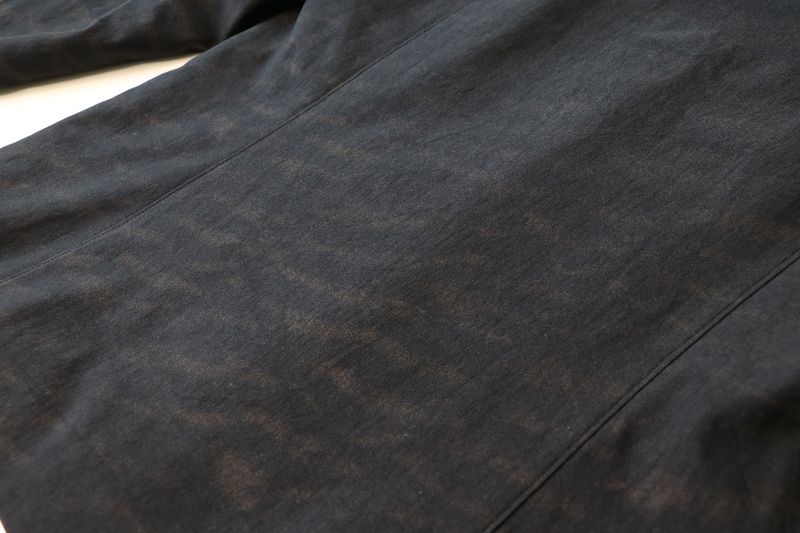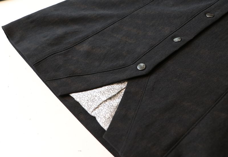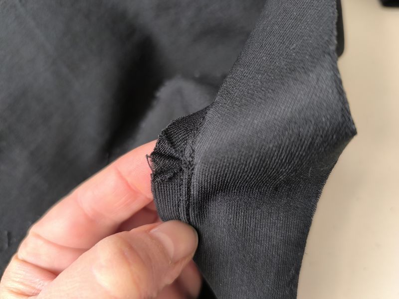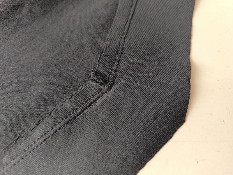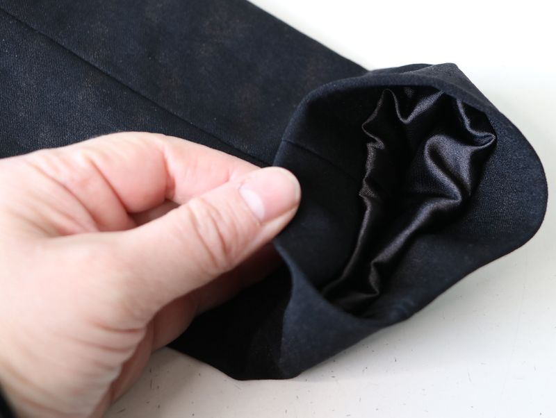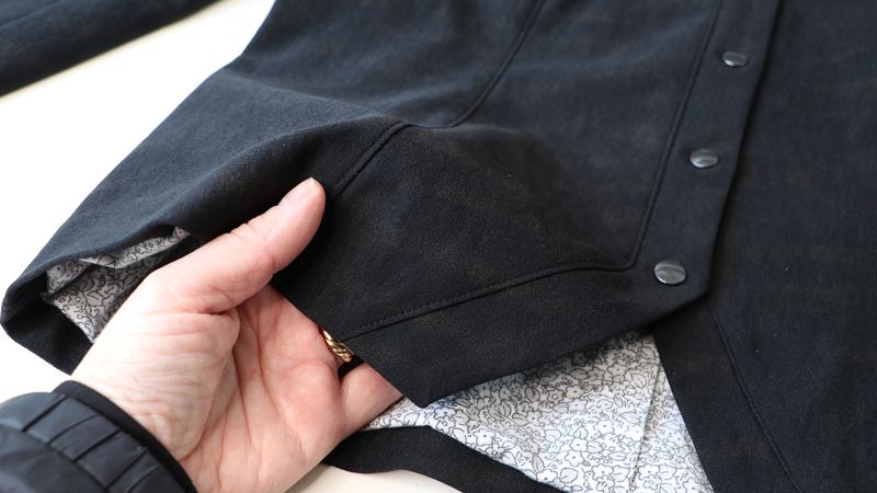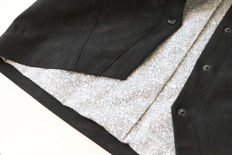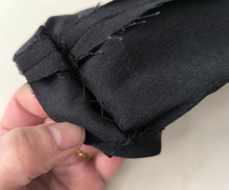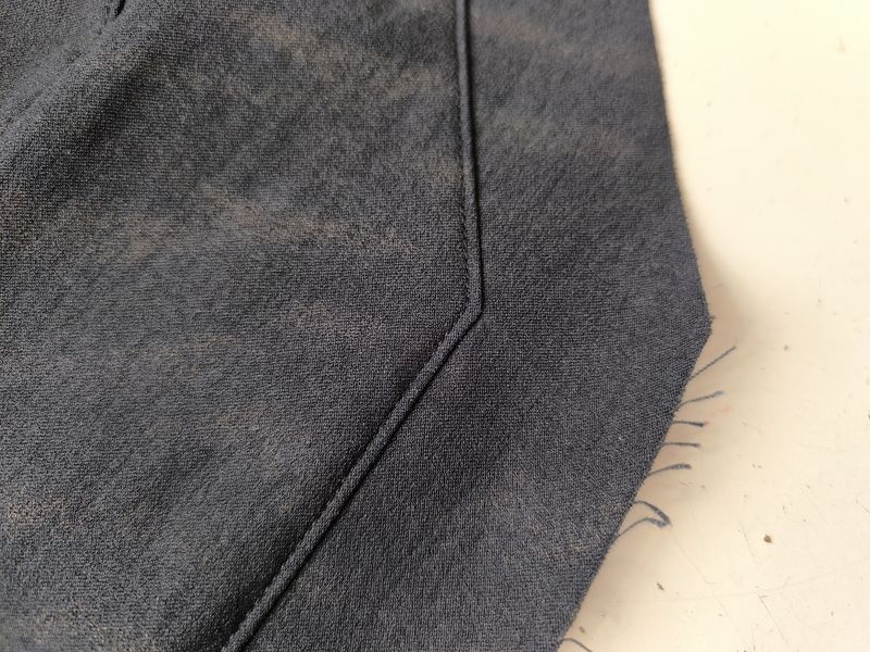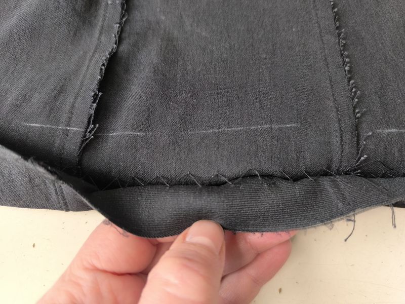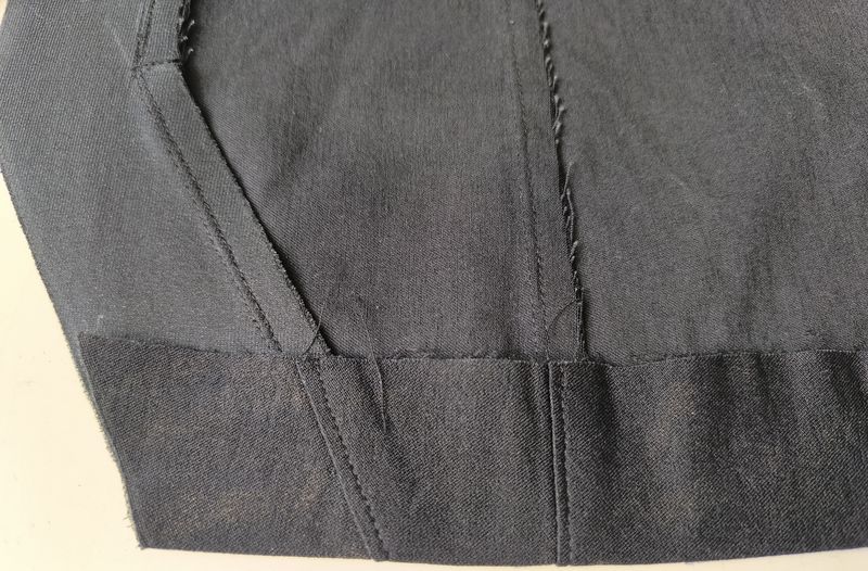 Détail de l’angle inférieur de la veste (bas de l’ourlet contrarié) :
