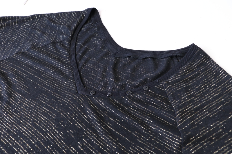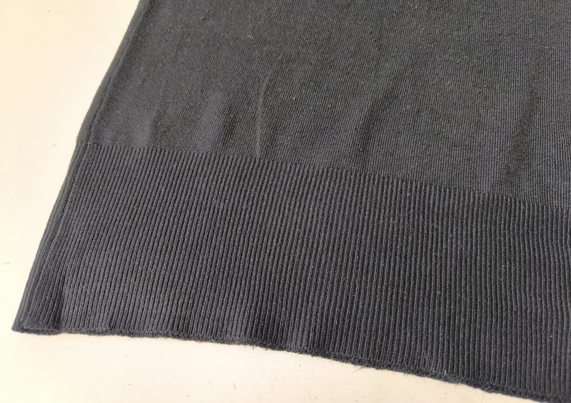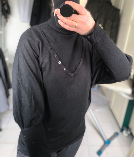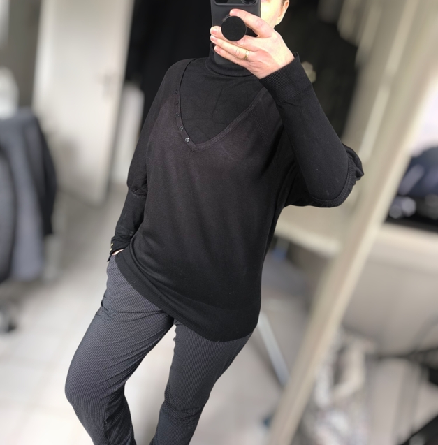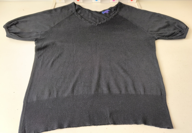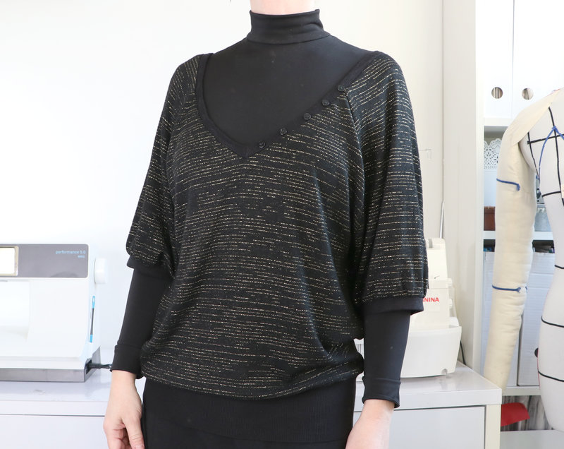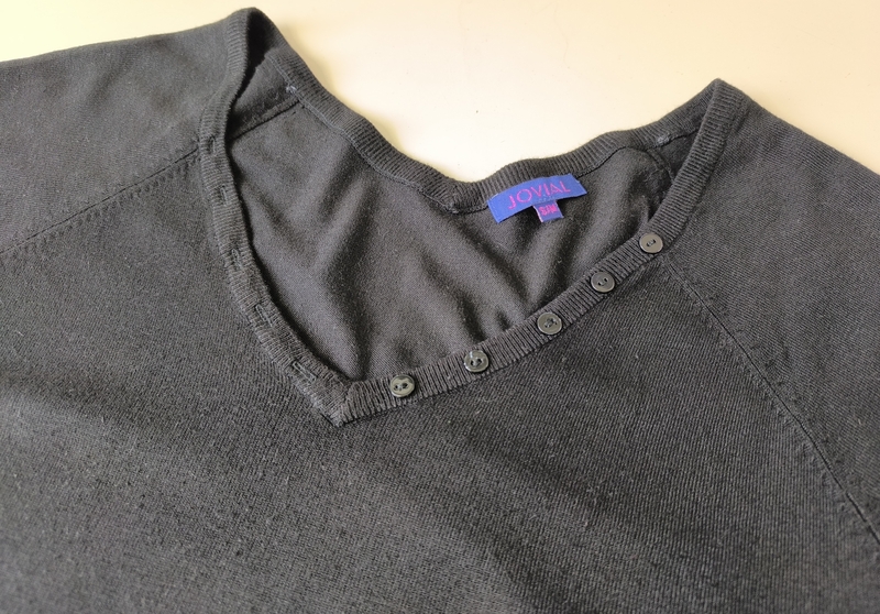 J’avais dans ma garde-robe un pull du commerce noir acheté il y a plus de 20 ans, un pull que j’ai pas mal porté durant toutes ces années car j’en appréciais particulièrement la coupe. Un pull facile à enfiler et à porter par dessus un sous-pull. Les manches sont de type raglan et chauve-souris, la coupe est ample et les encolures devant et dos sont décolletés en V. La bande de finition au devant est pourvue de boutons et boutonnières décoratives. Les manches sont de longueur coude et froncées au niveau du bas de manche. Voici le pull du commerce en question :