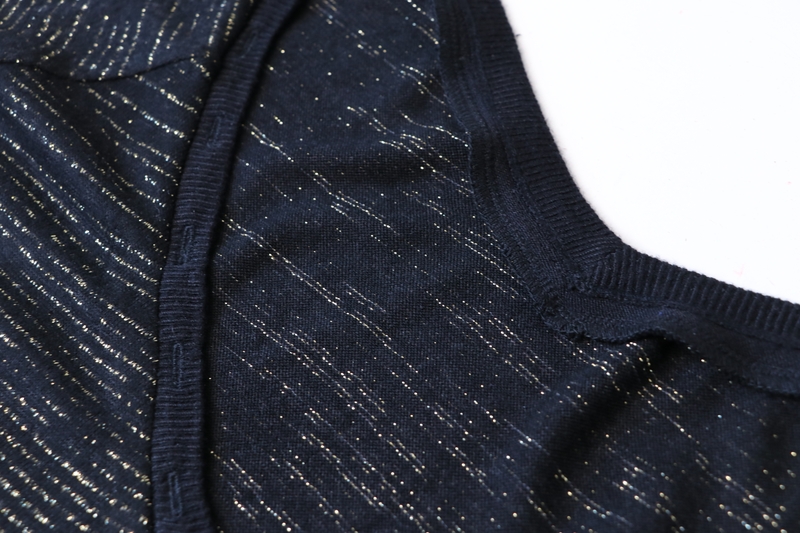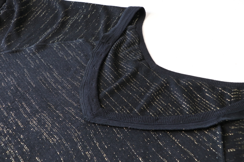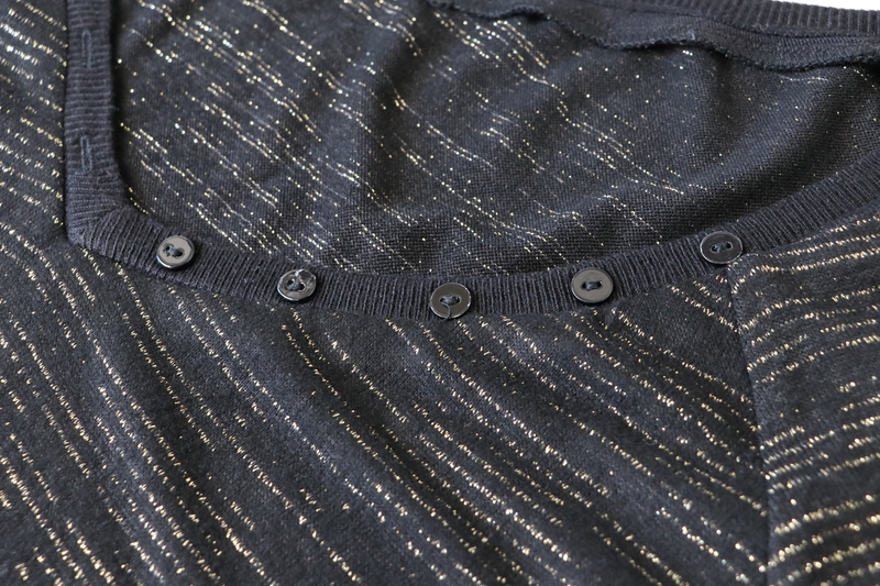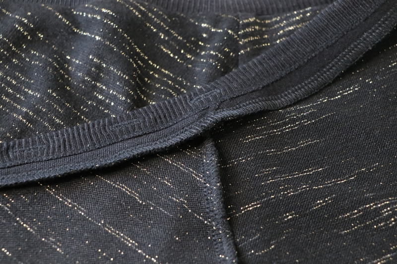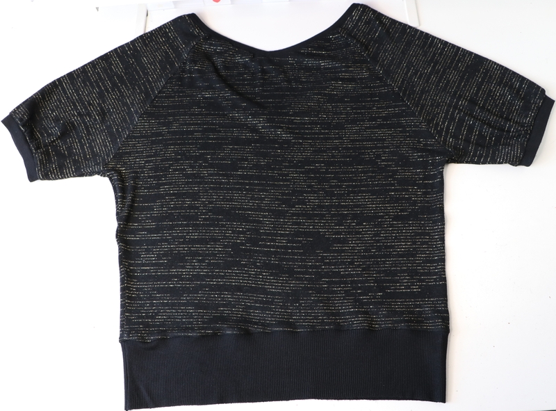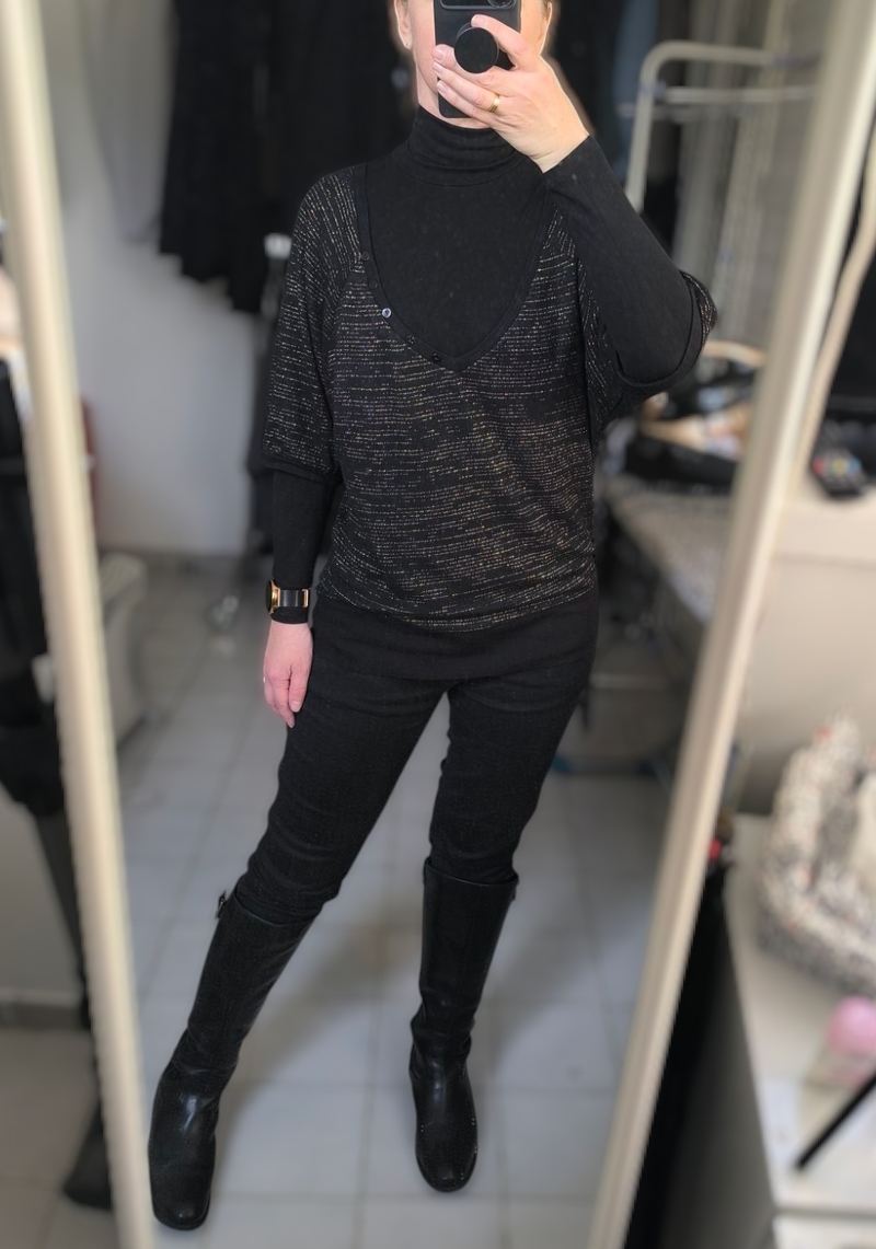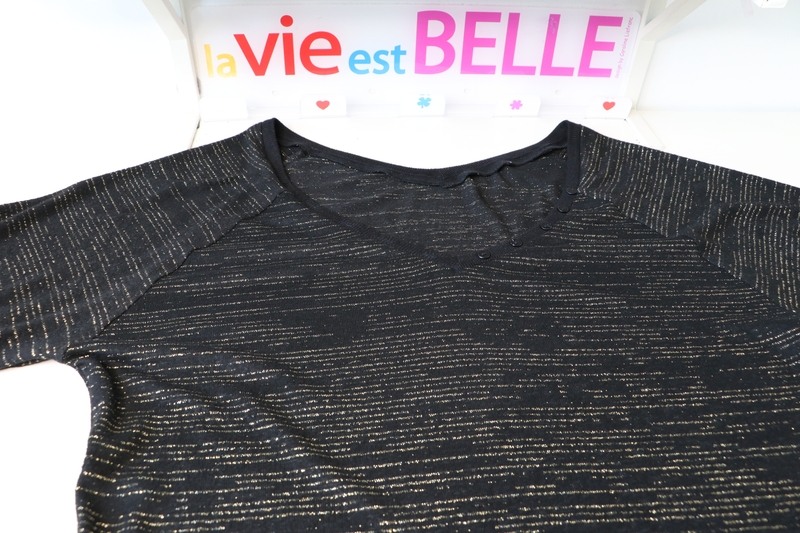 J’ai évidemment eu envie d’en faire une copie quasi conforme. Je venais tout juste de m’acheter cette maille fine noire & dorée. L’association des deux me plaisant bien, je me suis donc lancée. Voici le résultat devant & dos :