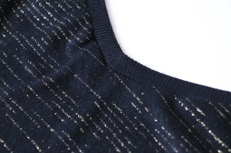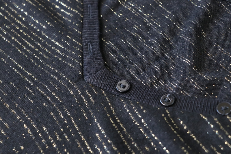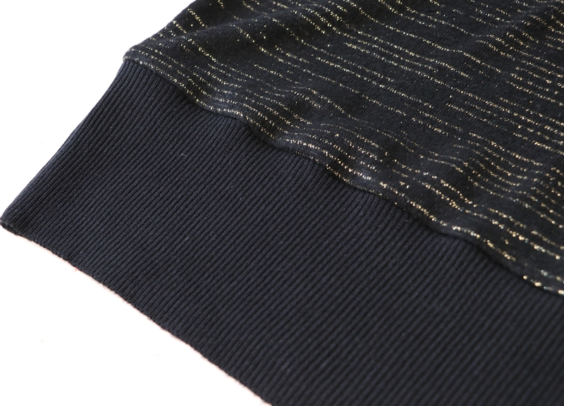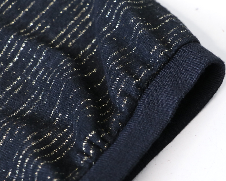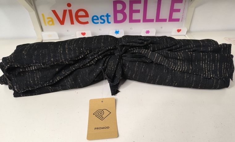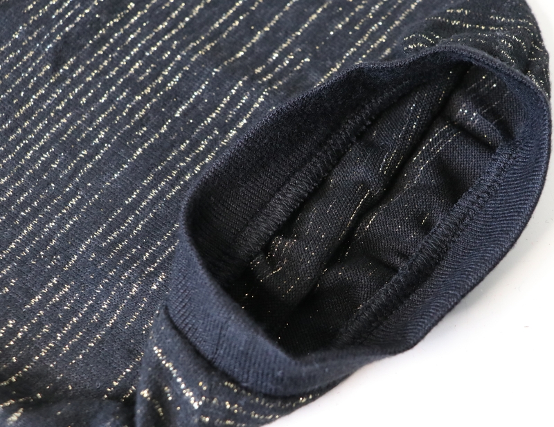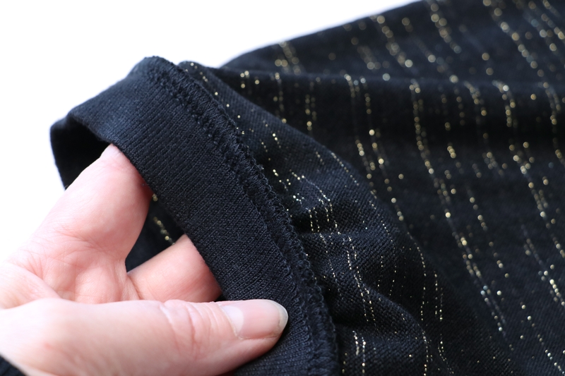 J’ai évidemment eu envie d’en faire une copie quasi conforme. Je venais tout juste de m’acheter cette maille fine noire & dorée. L’association des deux me plaisant bien, je me suis donc lancée. Voici le résultat devant & dos :