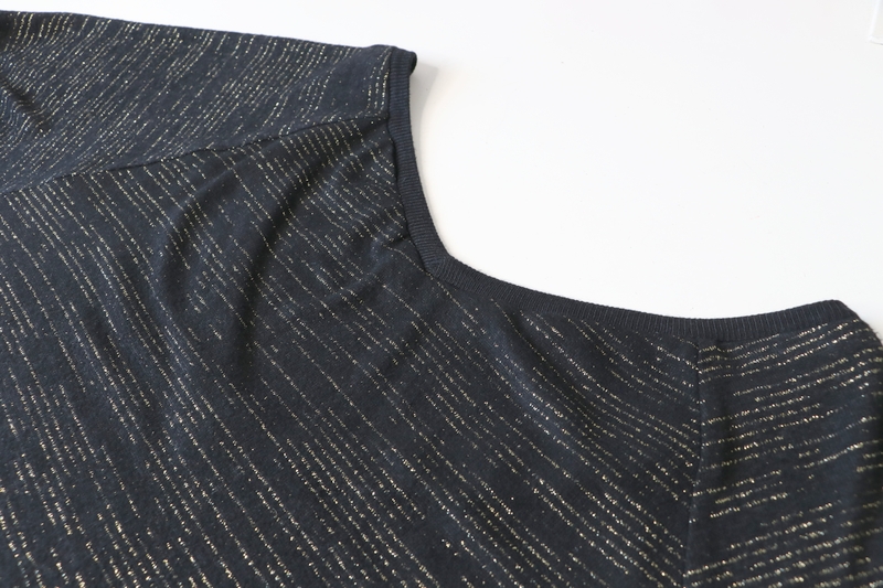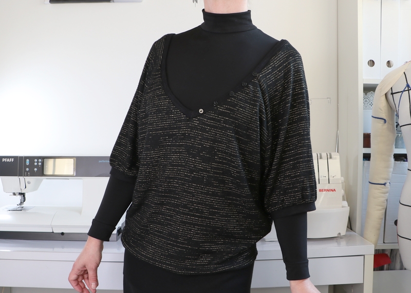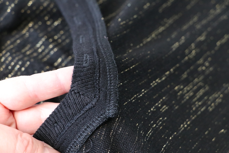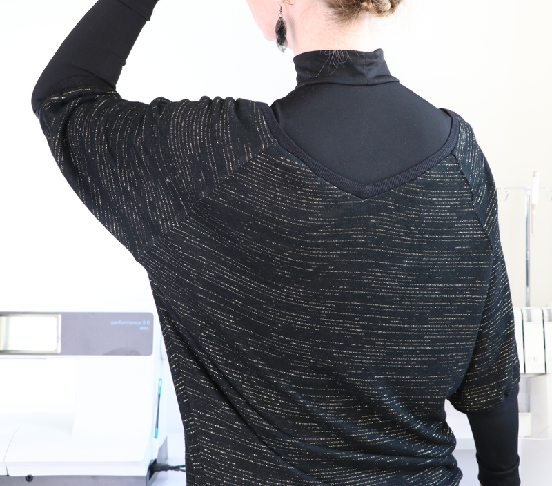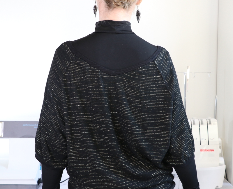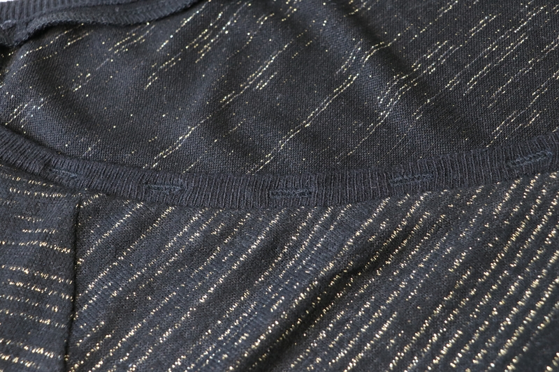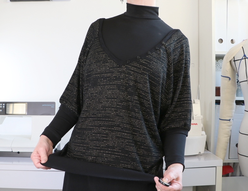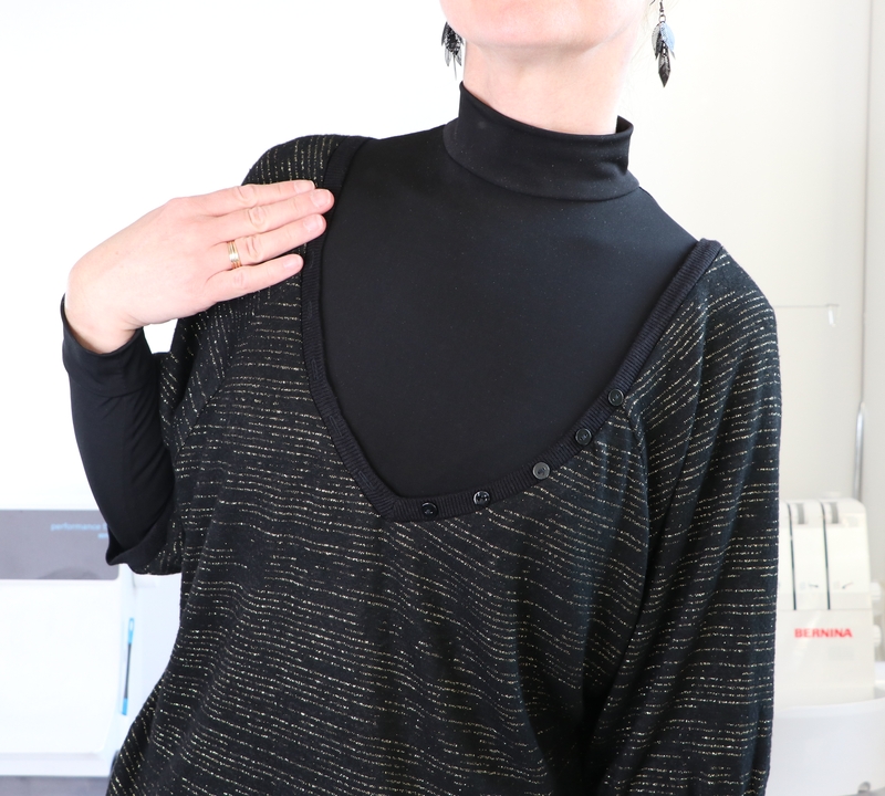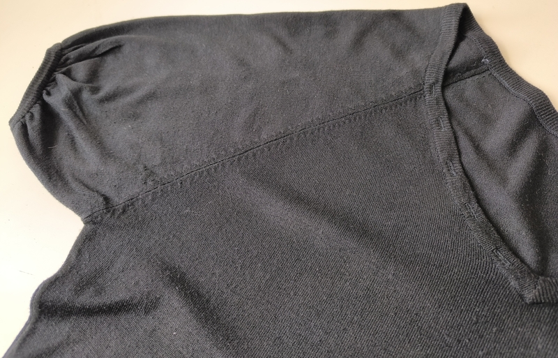 Le tissu étant plus fin et plus mou que mon pull du commerce, le rendu est donc différent notamment au niveau de l’encolure qui est du coup bien plus large & plus profonde que celle d’origine.
