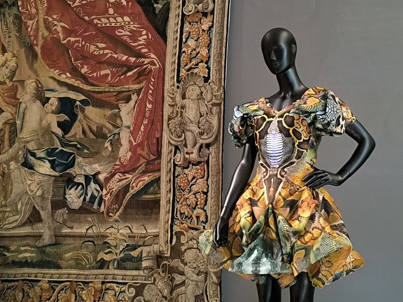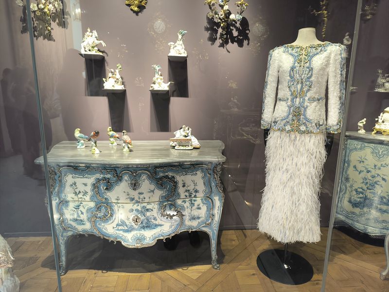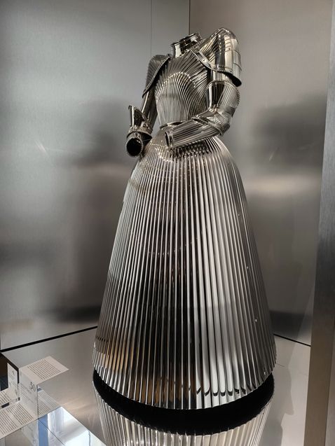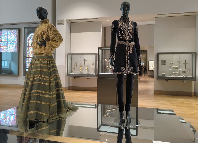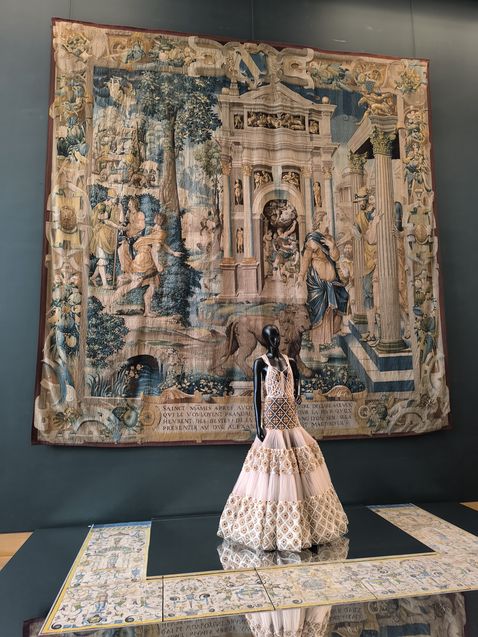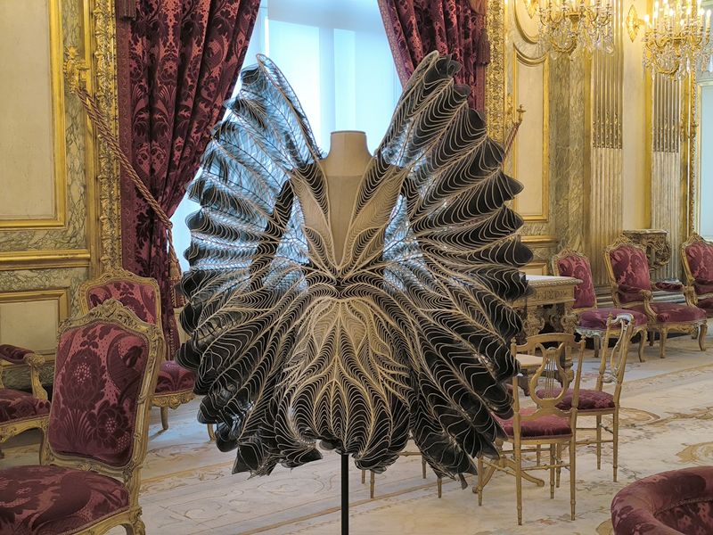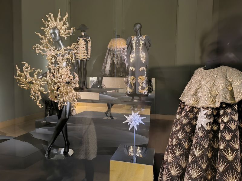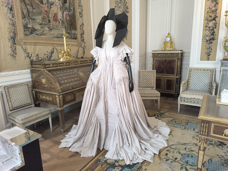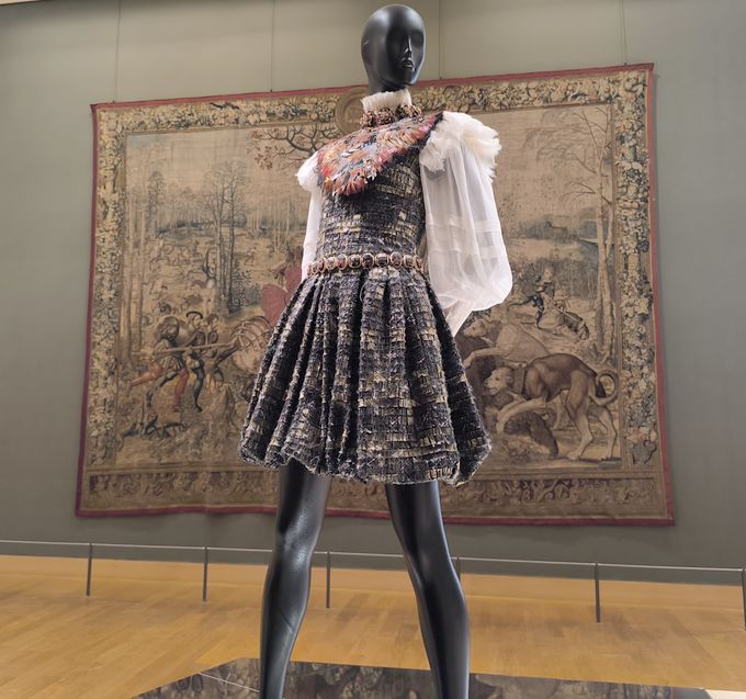 Voici la description de cette exposition : « L’exposition propose un dialogue saisissant et inédit entre les chefs-d’œuvre du département des Objets d’art du musée et des pièces marquantes de l’histoire de la mode contemporaine, entre les années 1960 et 2025, de Cristóbal Balenciaga à Iris van Herpen. Au long d’un parcours au cœur même des collections du musée, sur près de 9 000 mètres carré, c’est une centaine de silhouettes et d’accessoires qui résonnent de manière tout à tour savante, émouvante et poétique, avec l’histoire des arts décoratifs, celle des styles, des métiers d’art et de l’ornement, illustrant les liens très étroits qui unissent la mode à l’art. Autant de prêts remarquables accordés pour la première fois par quarante-cinq maisons et créateurs parmi les plus emblématiques de l’histoire de la mode. »