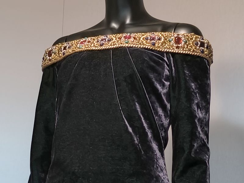 Comme les cabochons ornent une couronne, les pierres fantaisie brodées sur cette robe fourreau enserrent la ligne des épaules pour la sublimer. Ce bandeau rappelle les objets d’art du Moyen âge et de la Renaissance. Tout comme le velours qui était à l’époque très utilisé pour les vêtements et la décoration d’intérieur.